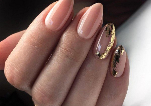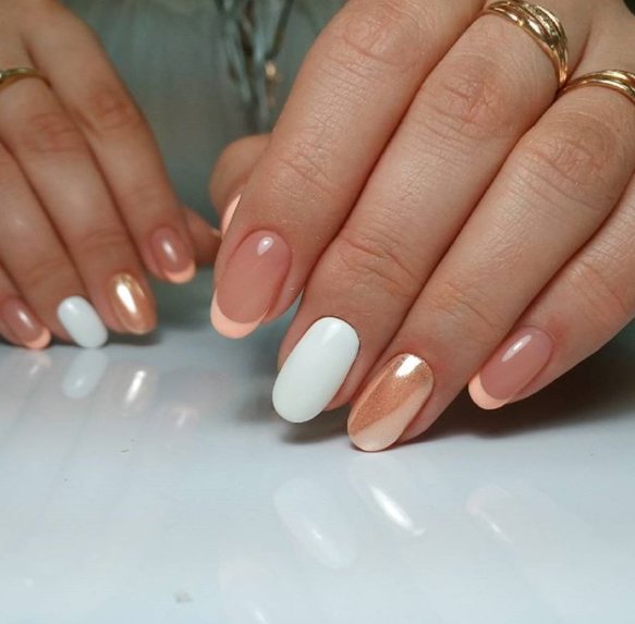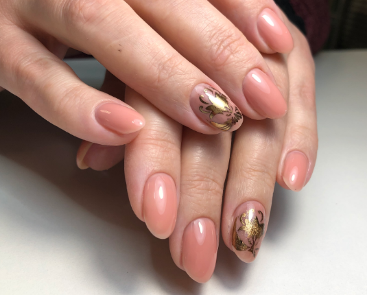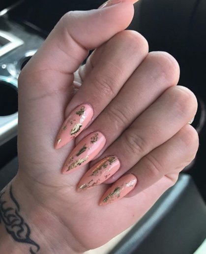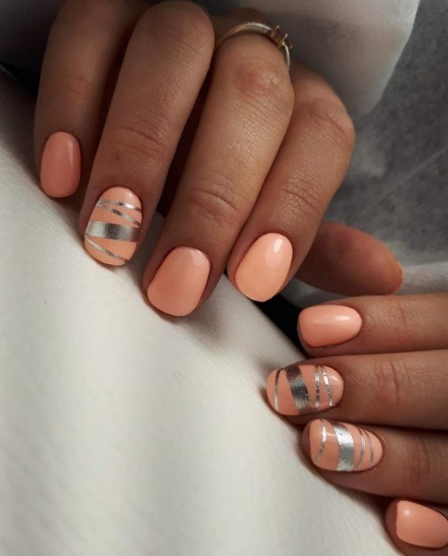Фольга в маникюре – оригинальное, необычное, яркое, может быть, даже дерзкое решение. Если использовать фольгу в маникюре персикового цвета, то получается интересная игра контрастов: нежный персиковый и металлический блеск прекрасно дополняют друг друга. Для этого стиля стоит использовать более яркие бежевые оттенки, чтобы не появилось дисгармонии.