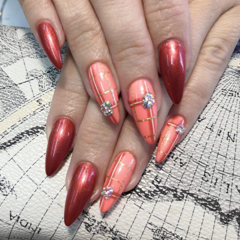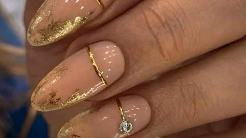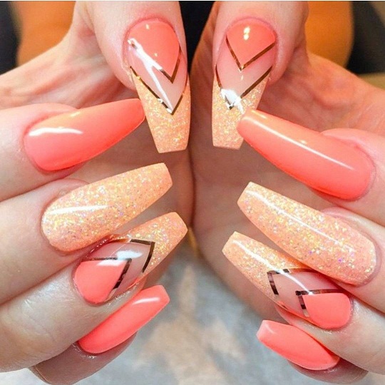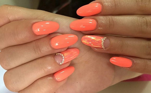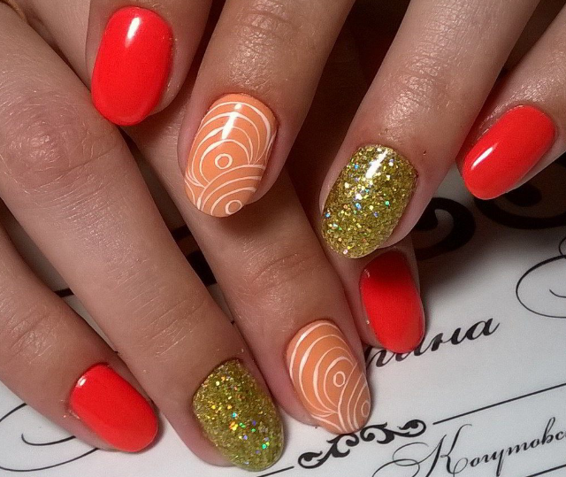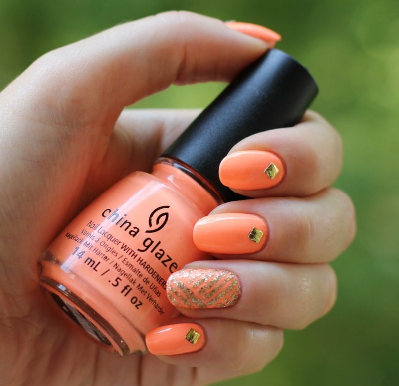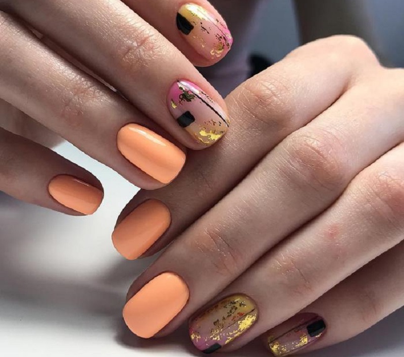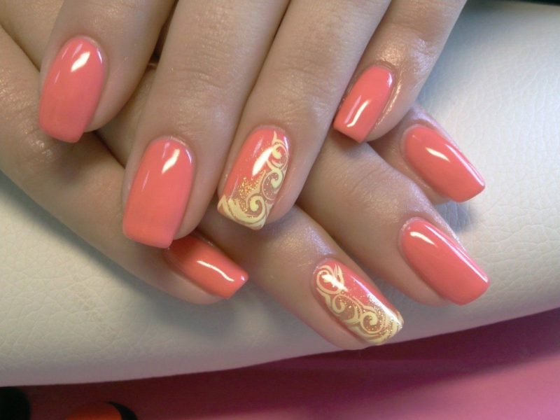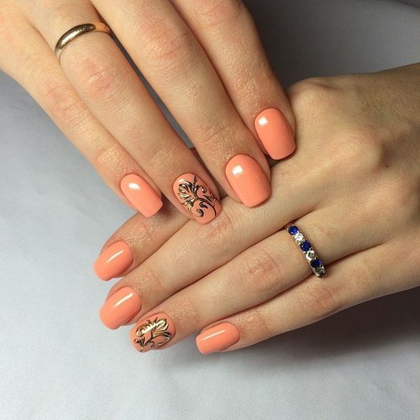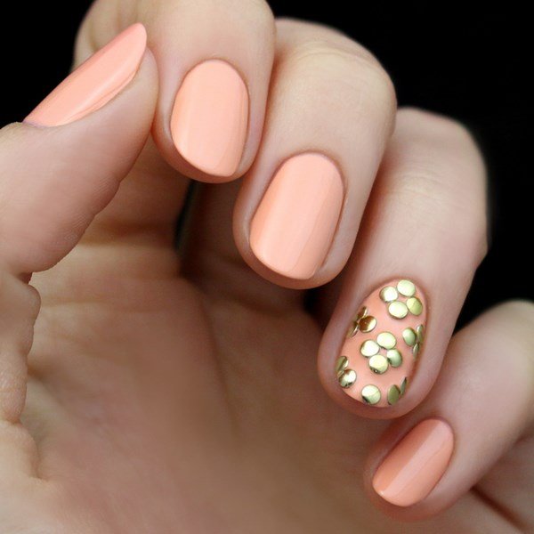 - С золотым. Персиковый лак прекрасно дополнит золото. Можно использовать со стразами, втирками, блестками для роскошных вечерних образов.