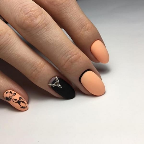 - С черным. Образец элегантности. Добавит вашему маникюру утонченный акцент. Будет интересно смотреться с техникой битого стекла. Еще идея – сделать на акцентном ноготке персиковое кружево на черном фоне.