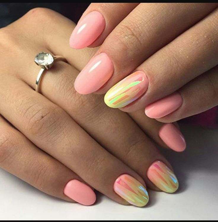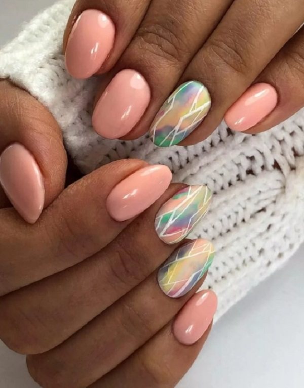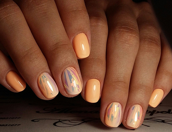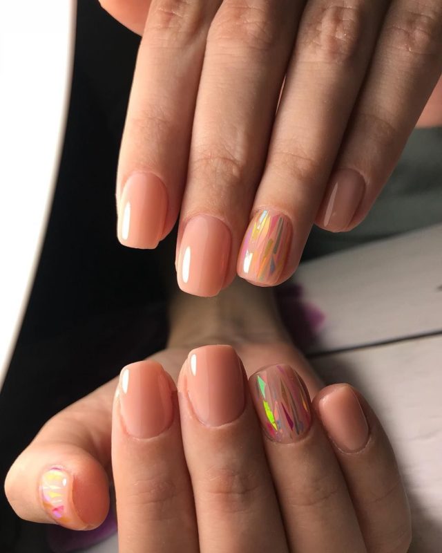 Покрытие красиво переливается разными цветами под разными углами зрения. В технике битого стекла предпочтительно делать один акцентный ноготь (например, на безымянном пальце) на руке, остальные оставив однотонными персиковыми.