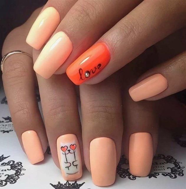 Персиковый маникюр на разную длину