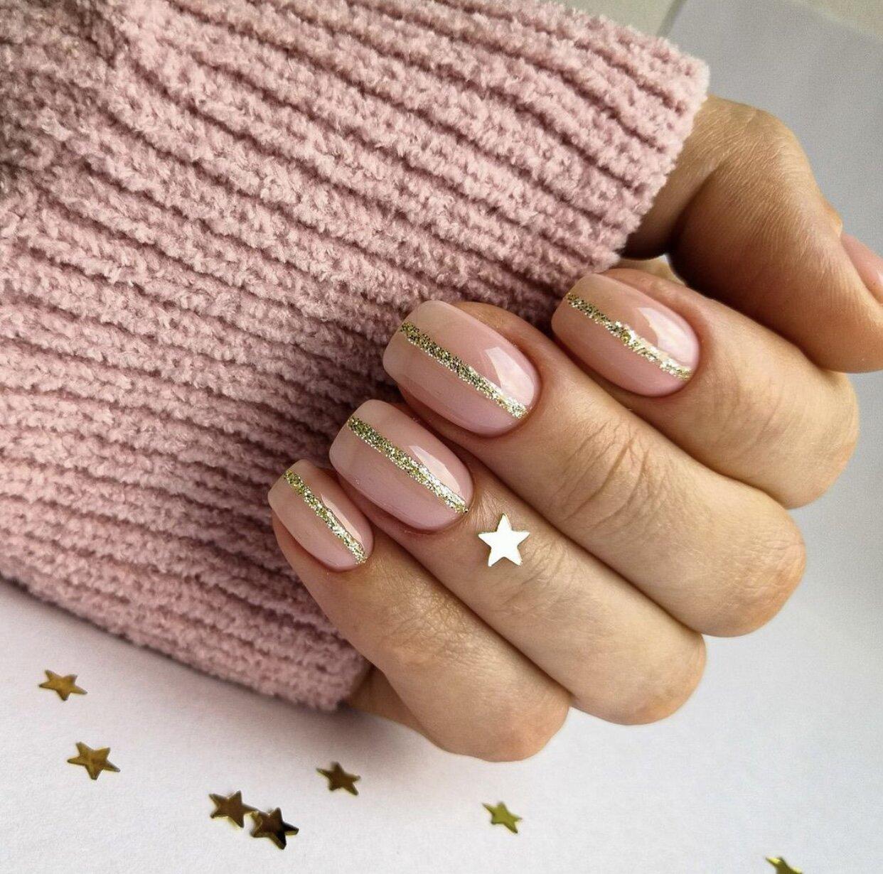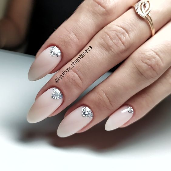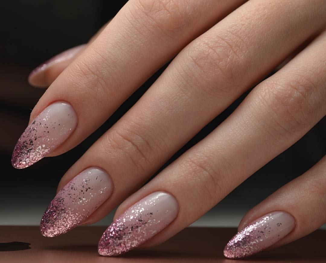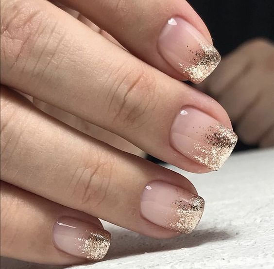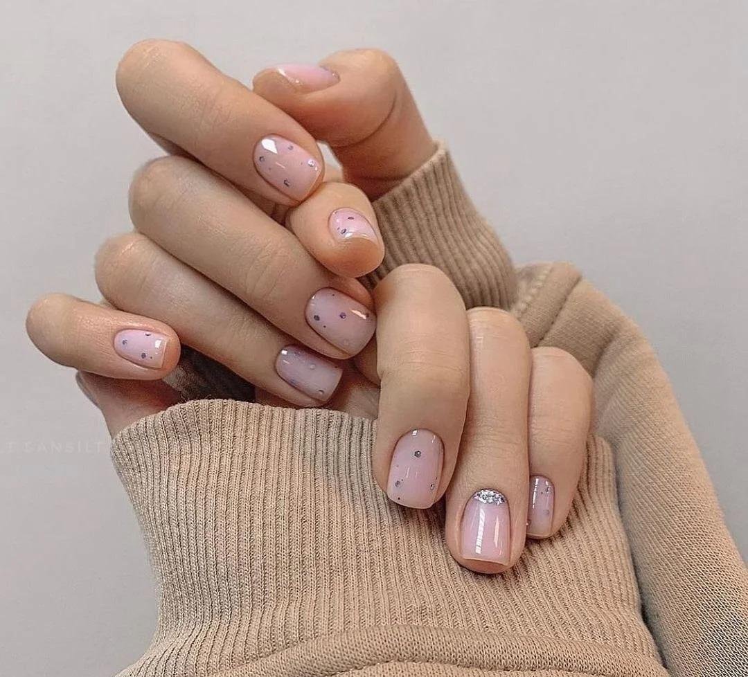 Просто нанесите кисточкой маленькие блестки или мелкий глиттер на ногтевую пластину или только на кончики, чтобы добавить немного блеска. Получится незатейливый. но очень стильный дизайн.
