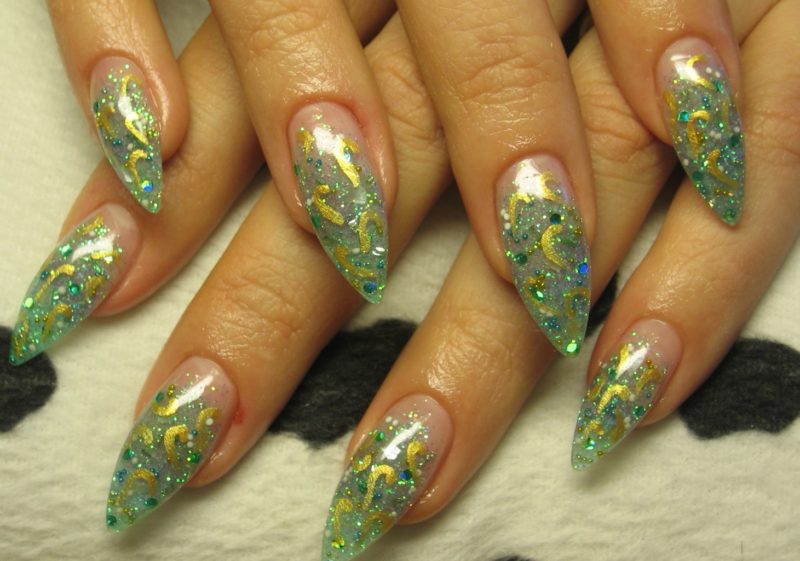Дизайн для длинных ногтей подойдет любого вида. Если хочется визуально укоротить пластину, можно украсить кончики украшениями или рисунками или использовать покрытие с цветовым наполнением. Это придаст изящности.