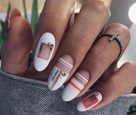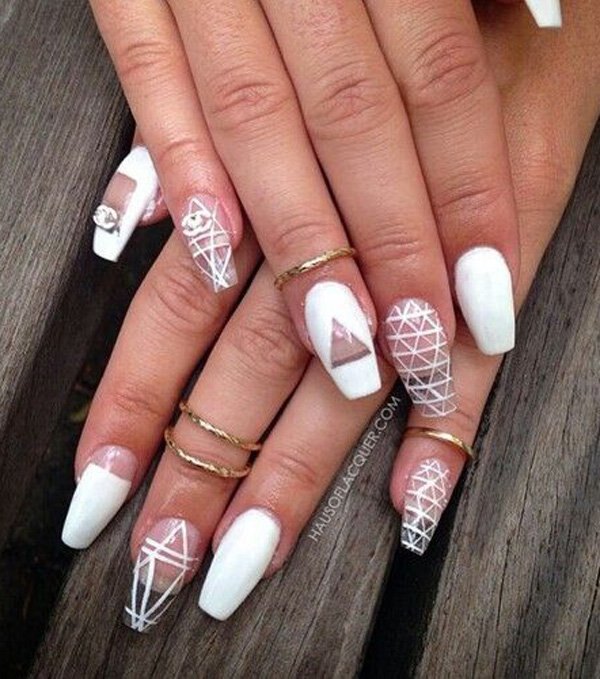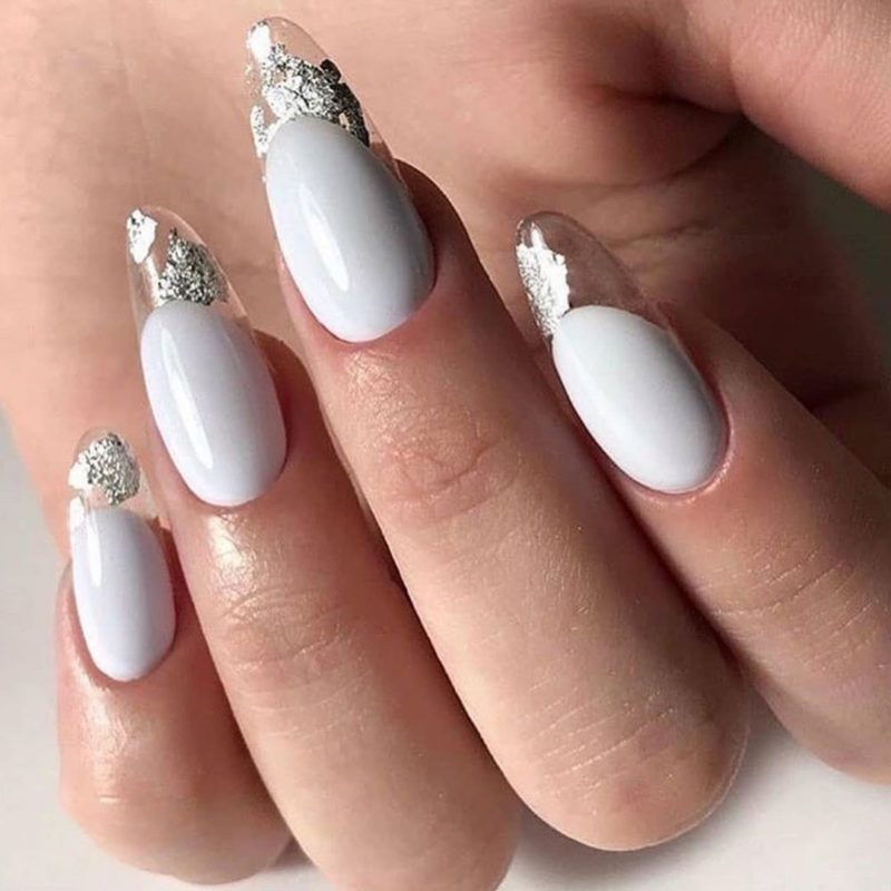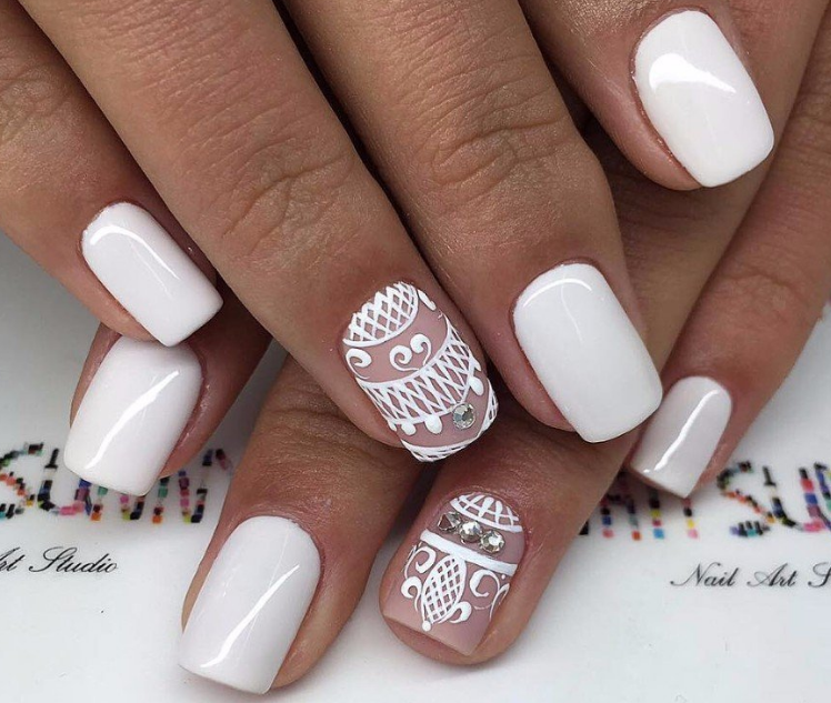 Использование белого лака в сочетании прозрачного фона уместно на любой случай.