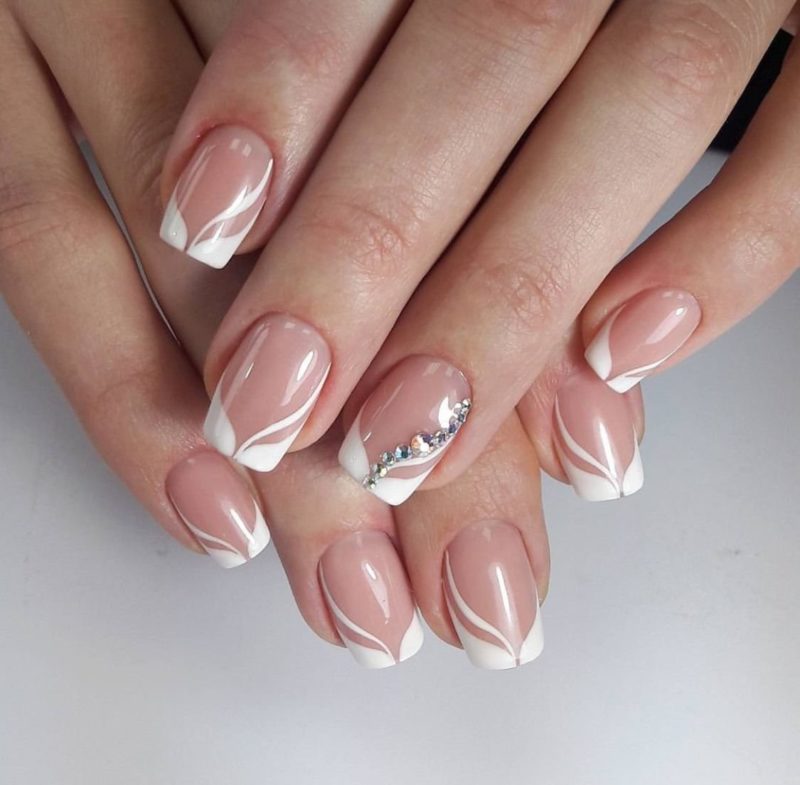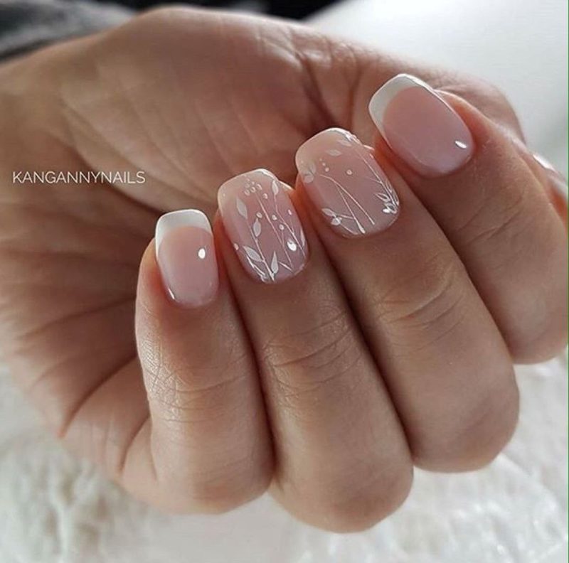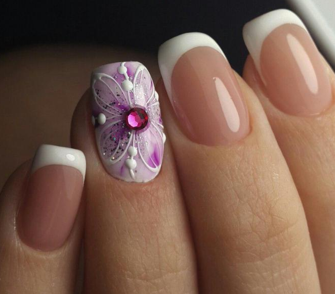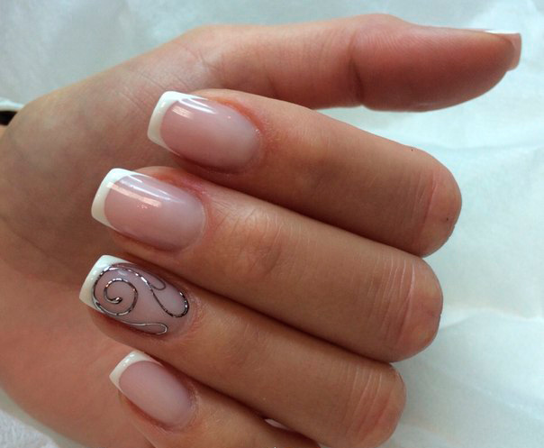 Маникюр в сочетании с белым цветом довольно часто выполняется в стиле френча. При этом на одном-двух пальцах может быть нанесён какой-либо рисунок или выполнено однотонное белое покрытие.