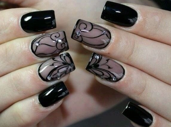 Очень интересно и изящно выглядят тёмные узоры на прозрачном фоне. Кроме того, черный цвет хорошо сочетается с любым декором, например, стразами, блестками. Однотонный вариант украшения можно выполнить, если смешать черный и бесцветный лаки таким образом, чтобы ушла плотность оттенка.