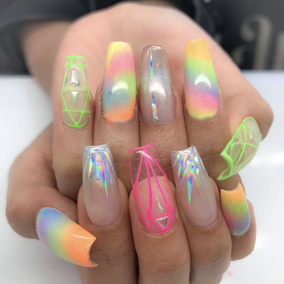 Неплотные оттенки, позволяющие видеть пластину, завораживают сочетанием и контрастом, привлекают к себе внимание. Вариантов создания дизайна ярких цветных, но одновременно прозрачных, ноготков много!