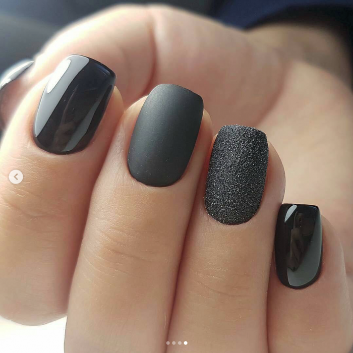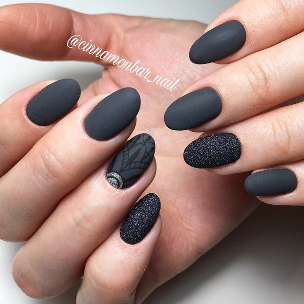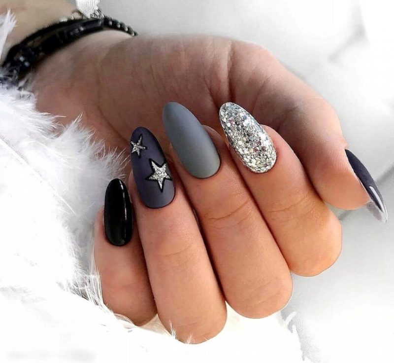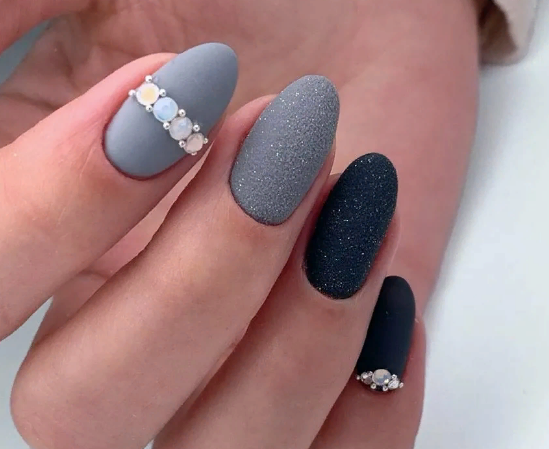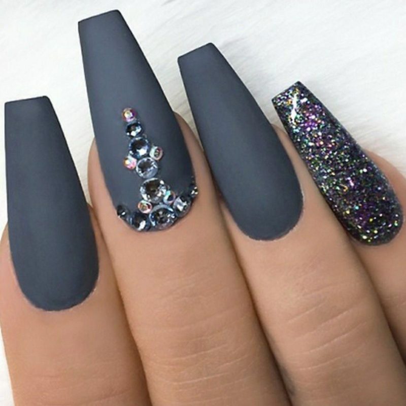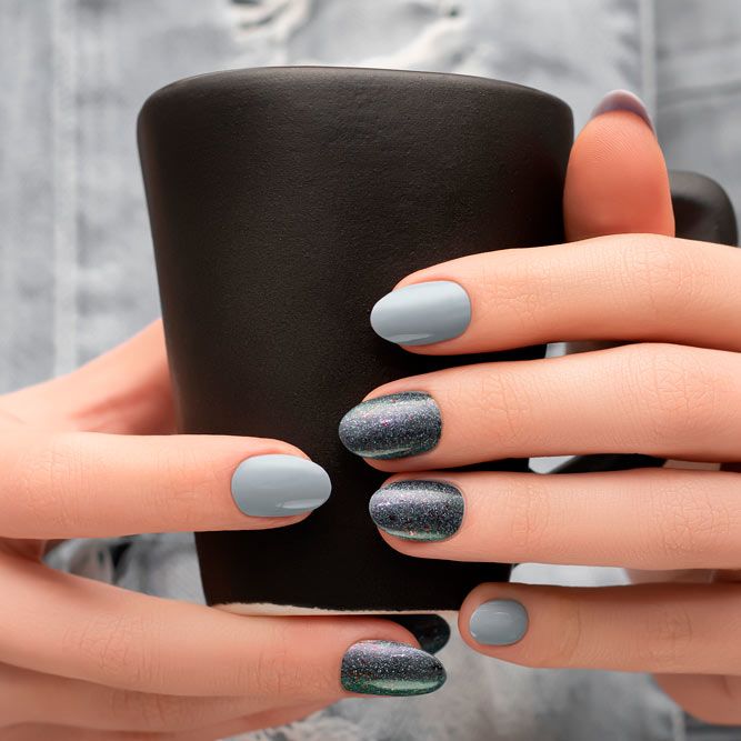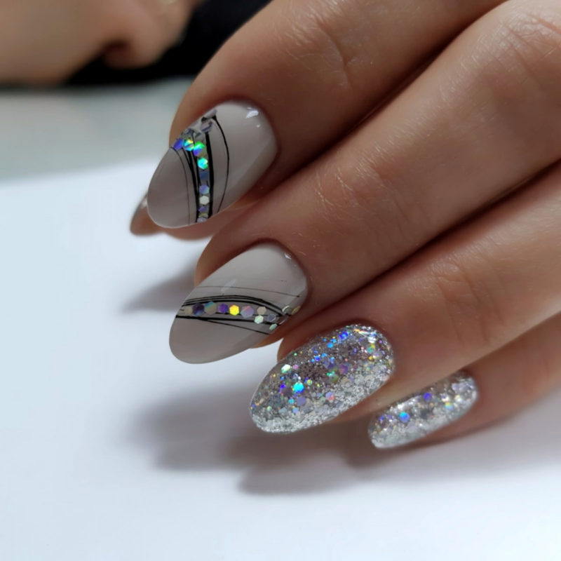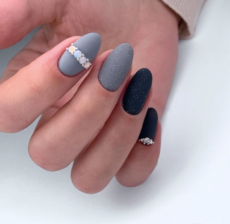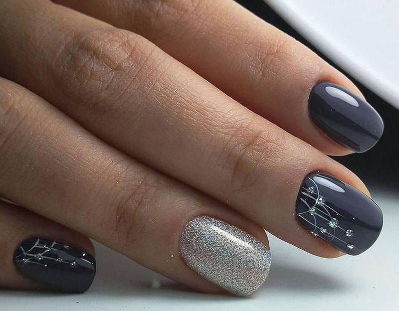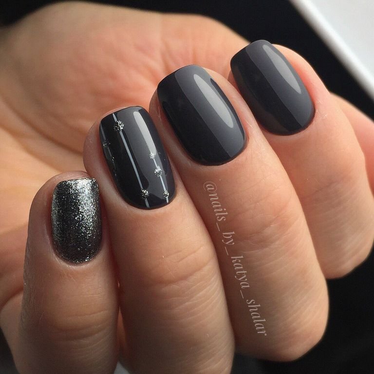 Блестящая фактура и камни на темном холодном фоне – гениальное, беспроигрышное решение. Чтобы маникюр не выглядел сильно вызывающим, можно несколько ноготков покрыть блестками и создать геометрический дизайн, а на остальных оставить серый шеллак. Выбирая размер блесток, можно по желанию подбирать либо крупные, либо мелкие. Также, дизайнеры допускают использование блесточек в сухом или жидком виде.