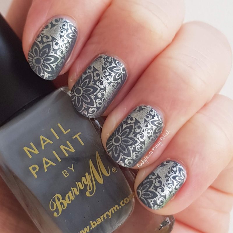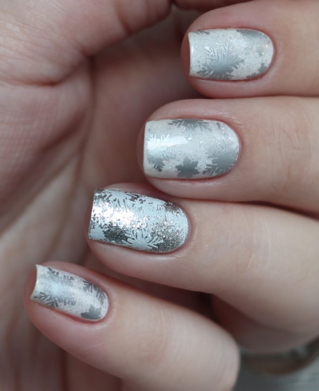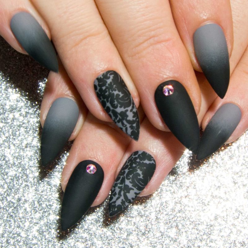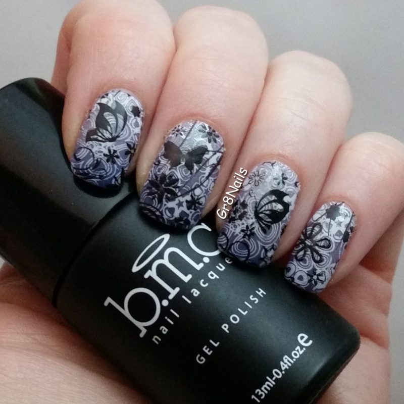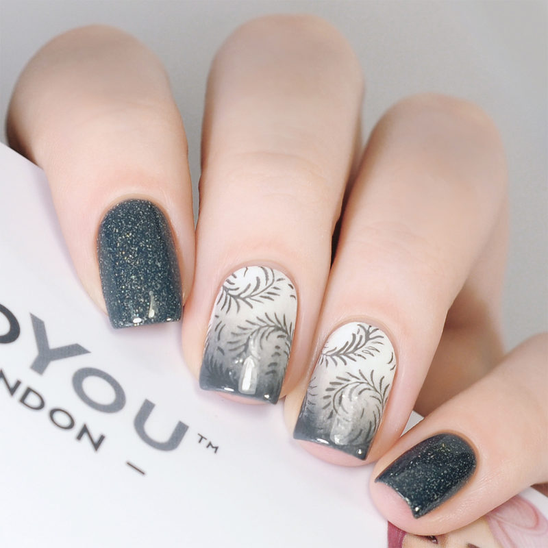 Те, кто не знают данного понятия, должны знать, что это художественный маникюр, при котором при помощи специального трафарета можно сделать принт любой сложности. Особенно эффектно смотрится стемпинг на размытой серой базе, создающей эффект дымки. Дымчатая основа завораживает, а сложные рисунки привлекают внимание.