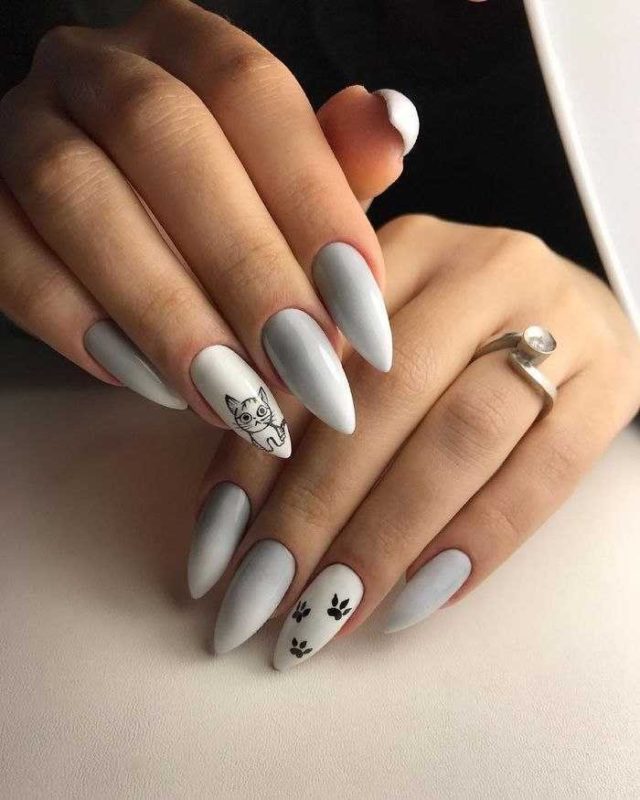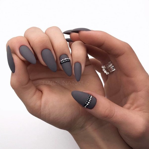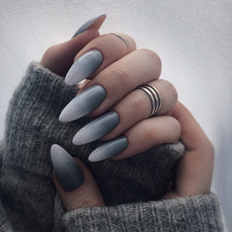 Длинные ногти несколько агрессивны из-за своих размеров и формы. Но покрыв их серым шеллаком, удастся придать дизайну маникюра нежности и мягкости, излишняя резкость не будет бросаться в глаза.