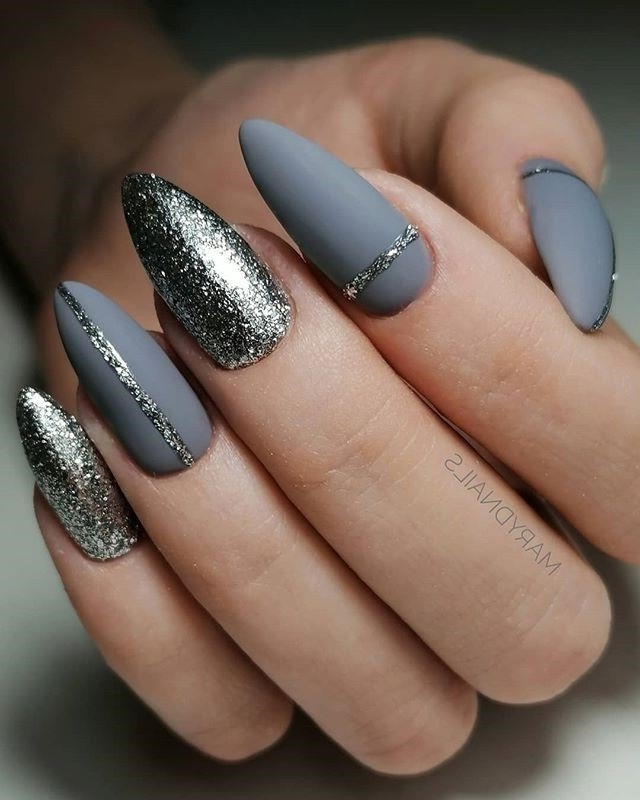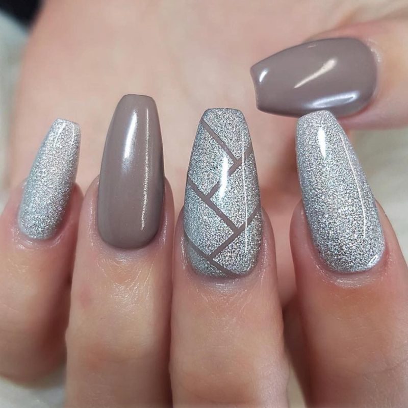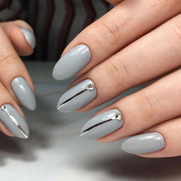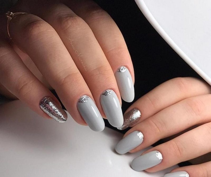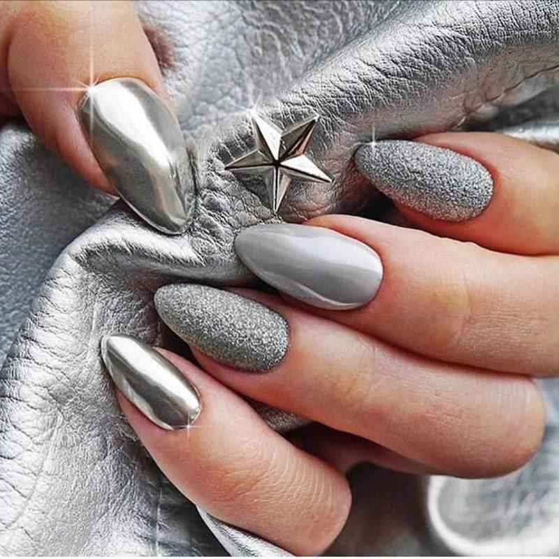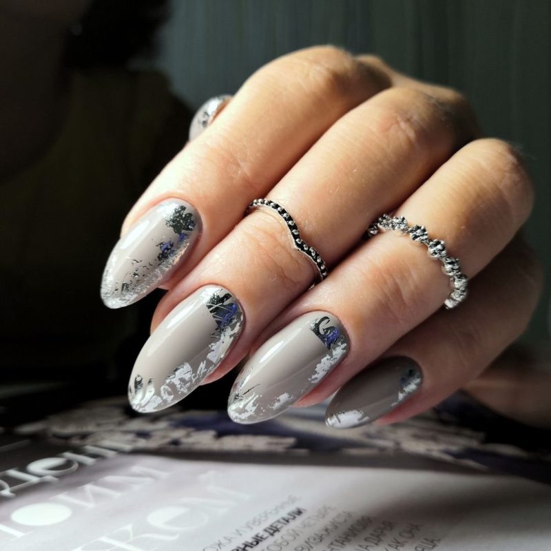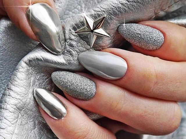 Дизайн ногтей серебристый – идеальная комбинация с серым. Эти два оттенка дополняют друг друга и вполне способны создать как праздничное настроение, так и стильный дизайн ногтей для офисных бедней. Стоит ли говорить, что сочетание серый с серебром в маникюре подходит к любой одежде.