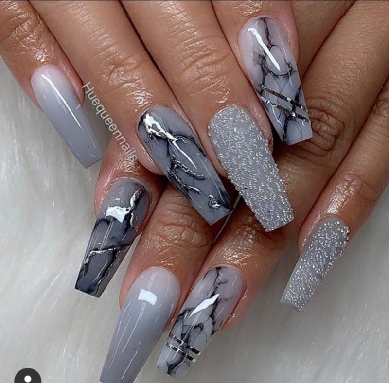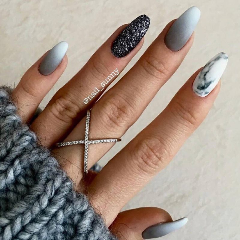 Среди огромного количества вариантов нейл арта, ахромат с оттенками иных цветов занимает лидирующие позиции, а в некоторых моментах и опережает их. Например, мрамор в серых тонах — бессменная классика, а блестки на сером фоне придают личности особого шарма.