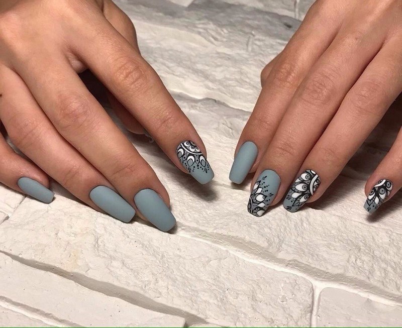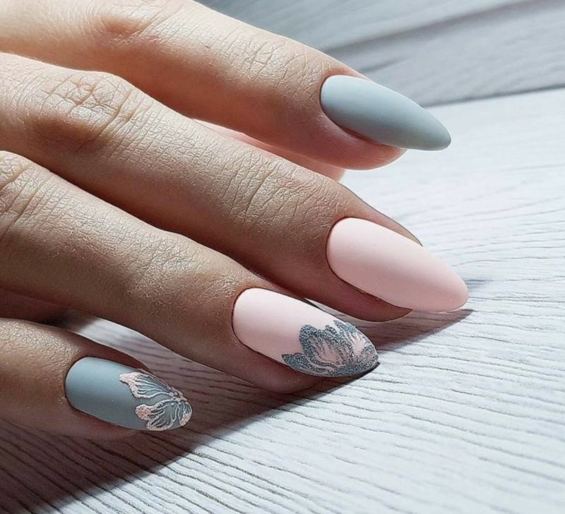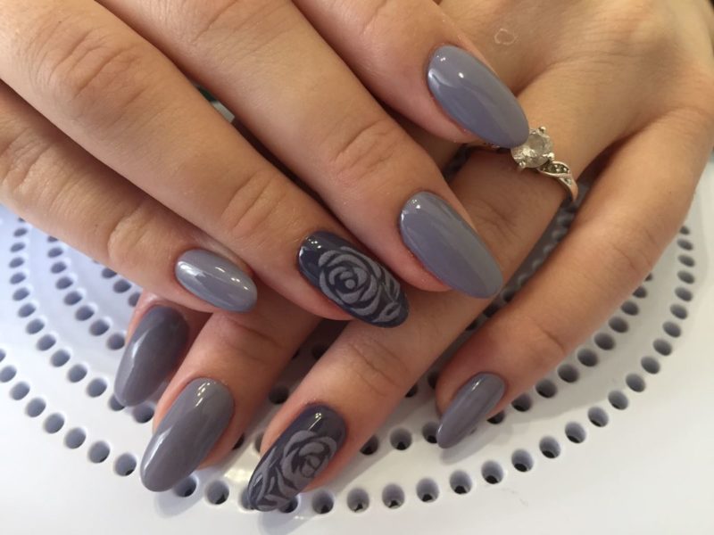 Сложное, но одновременно с этим оригинальное решение. Но опытному мастеру все по плечу, к примеру, можно сделать однотонный маникюр в серо-голубой вариации. Это уже привлечет внимание окружающих. А если дополнить дизайн золотыми камушками или блестками, будет очень оригинально. Еще одно решение в данном сочетании – вензеля или же «розовое золото».