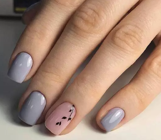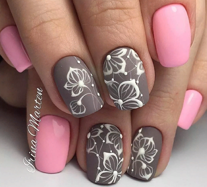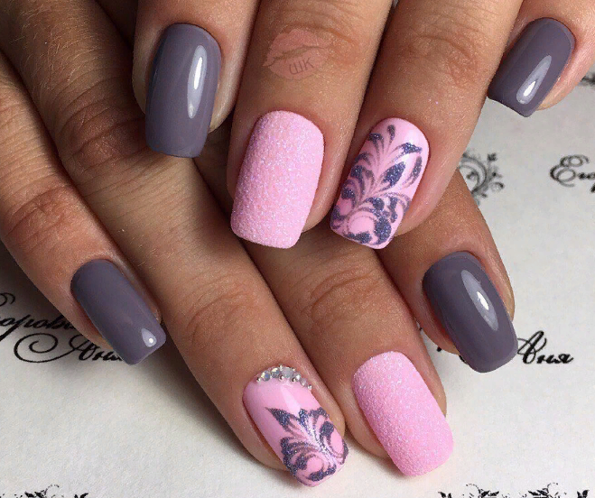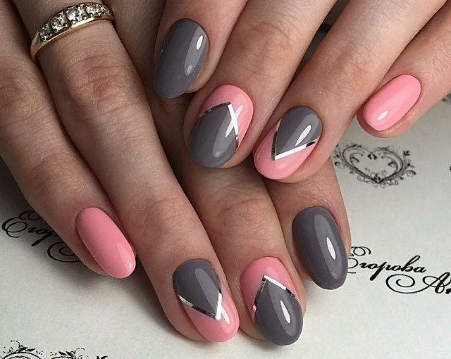 Серый и розовый — это, наверное, одно из самых удачных сочетаний в маникюре. А если дополнить тандем серебром, получим ультрамодный дизайн. Розовый сам по себе является нежным и легким оттенком, а серий придаст ему определенной интеллигентности. Главное при создании дизайна в такой композиции – правильно соотнести цвета для маникюра. Можно покрасить одну половину ногтя серым, а другую – розовым. С другими оттенками данный дизайн не всегда удачно гармонирует, поэтому рисунок других оттенков здесь вряд ли будет уместен.