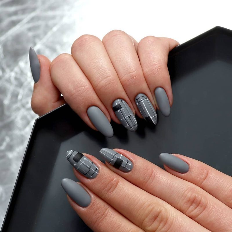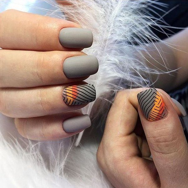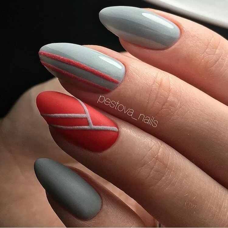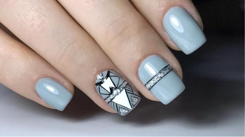 Идеально нарисованные геометрические рисунки на строгом сером фоне делают образ завершенным. Необязательно придерживаться симметрии между линиями, «творческий» подход мастера сделает маникюр уникальным.