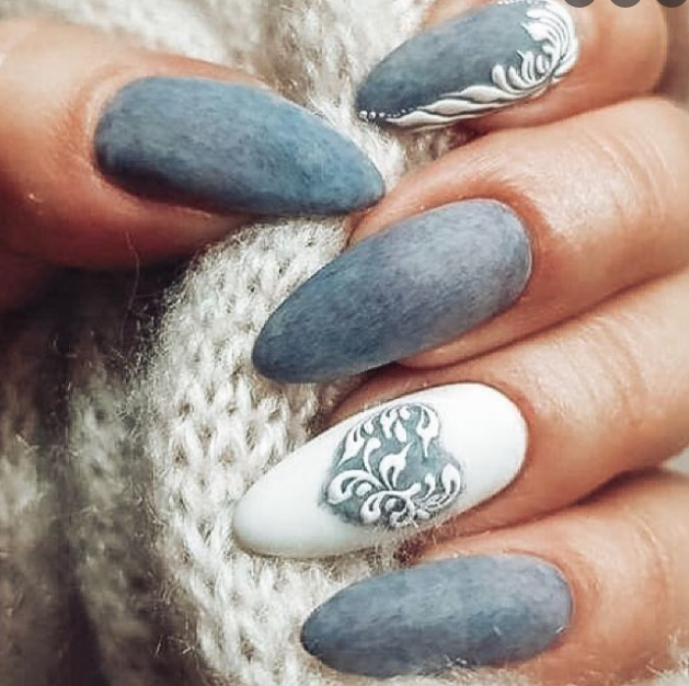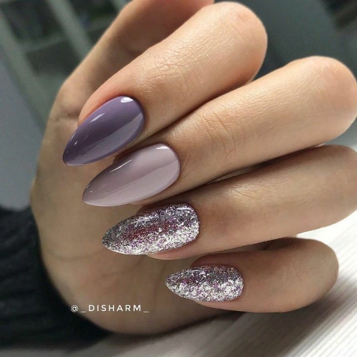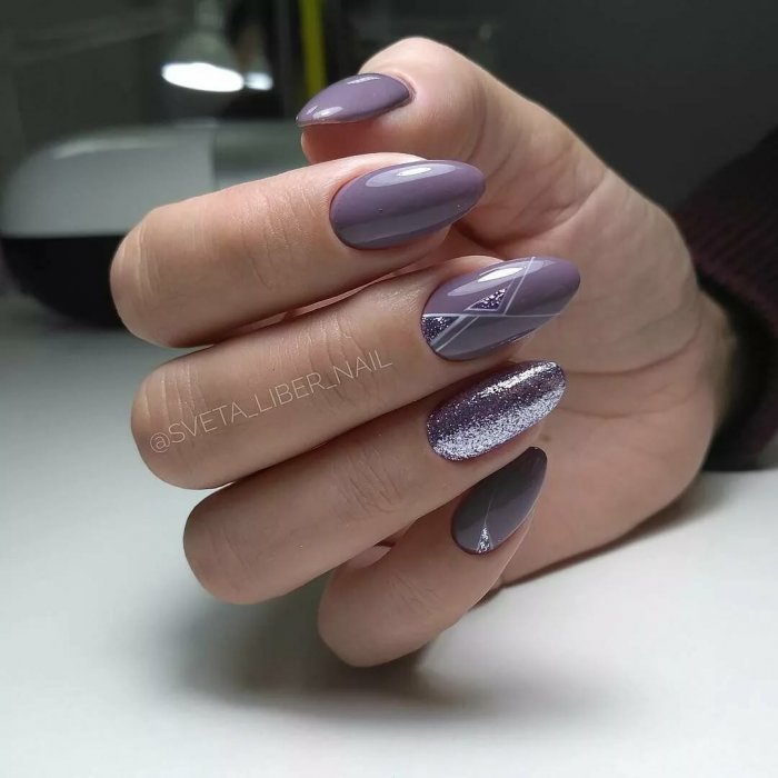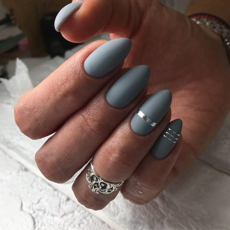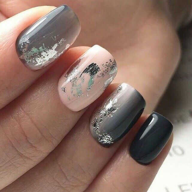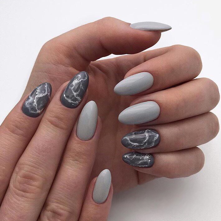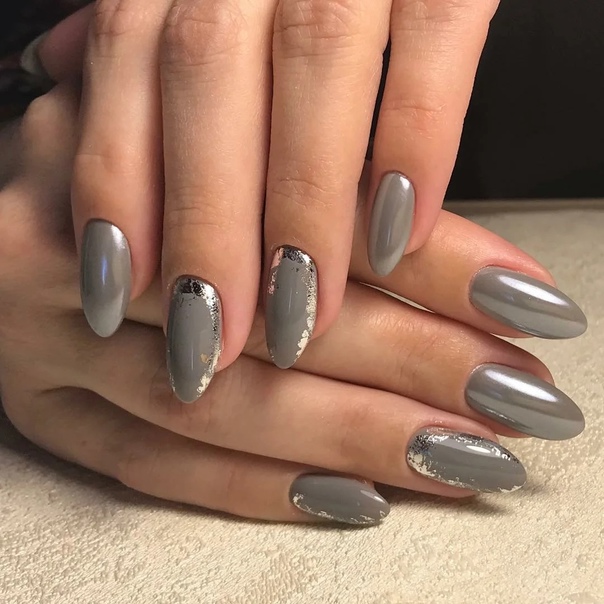 Универсальный серый с добавками других подтонов одинаково эффектно смотрится на любой длине и форме пластины. Он универсален и не делает ноготок меньше, не меняет визуально форму. В зависимости от того, какого эффекта хочет добиться мастер, выбирают плотную или полупрозрачную основу. Данному дизайну подходит квадратная и овальная форма ноготков.