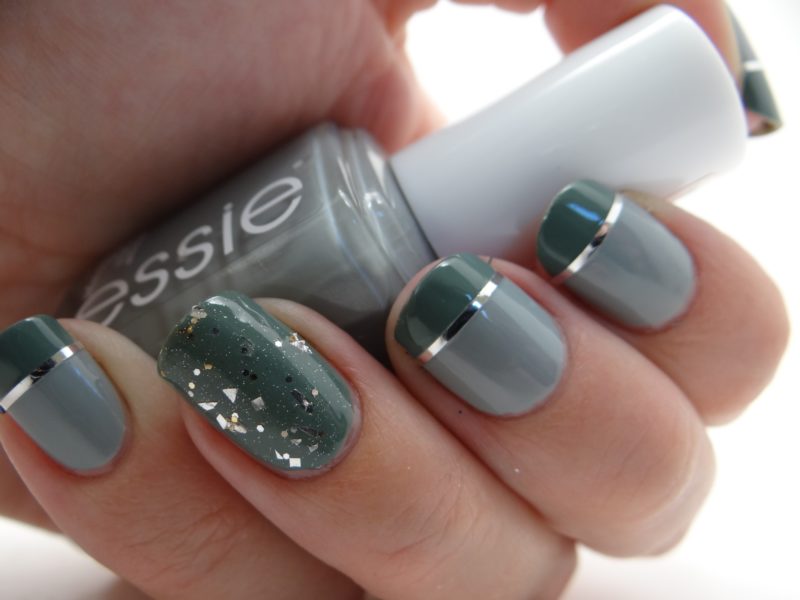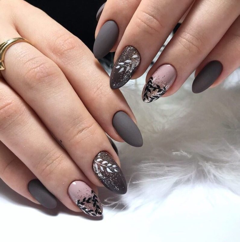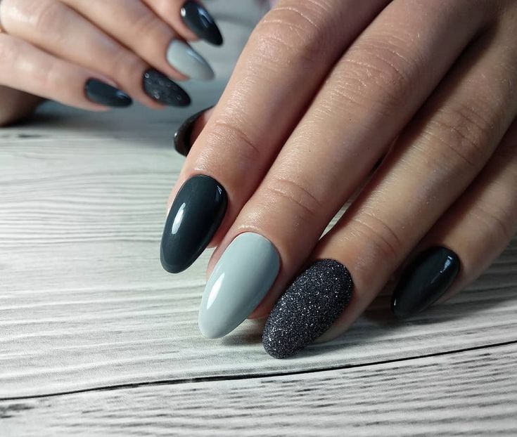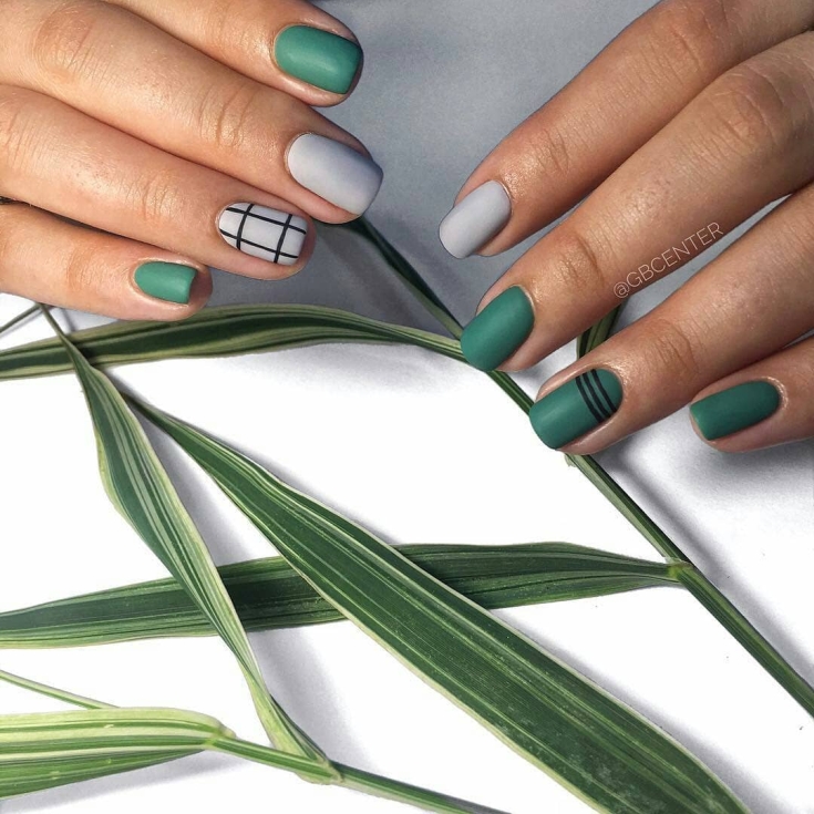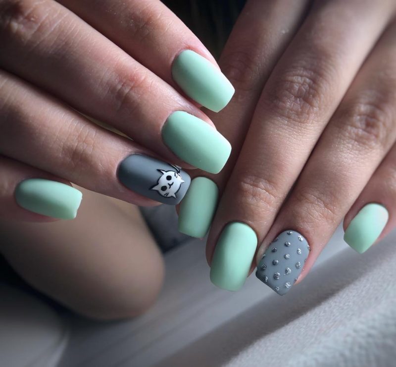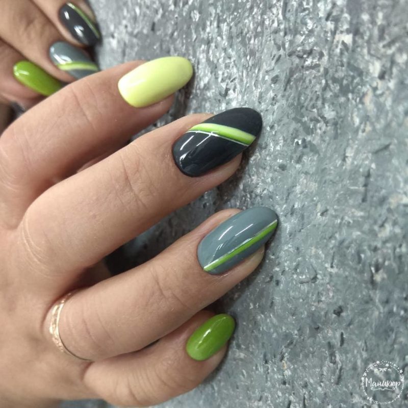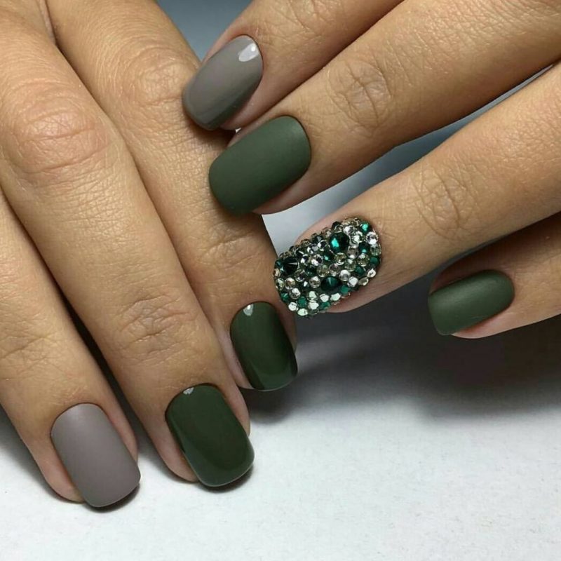 Два сильных тона в дизайне, которые совмещаются, создавая контраст. Во время работы с этими оттенками мастера используют дополнения и узоры. Как показывает практика, комбинация серого с зеленым отлично смотрится на длинных острых ноготках. Данное покрытие придаст маникюру мягкости.