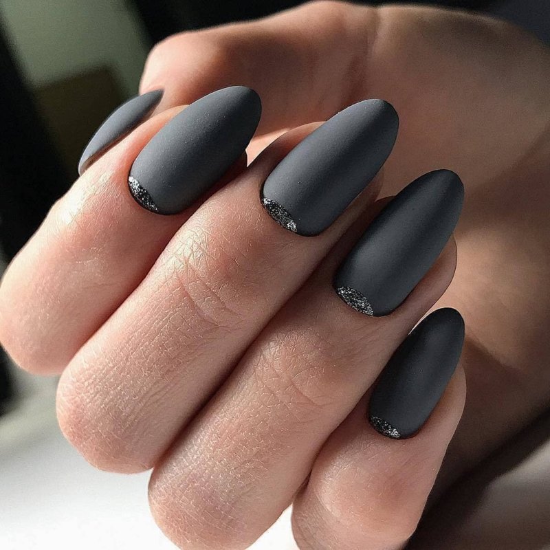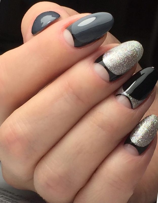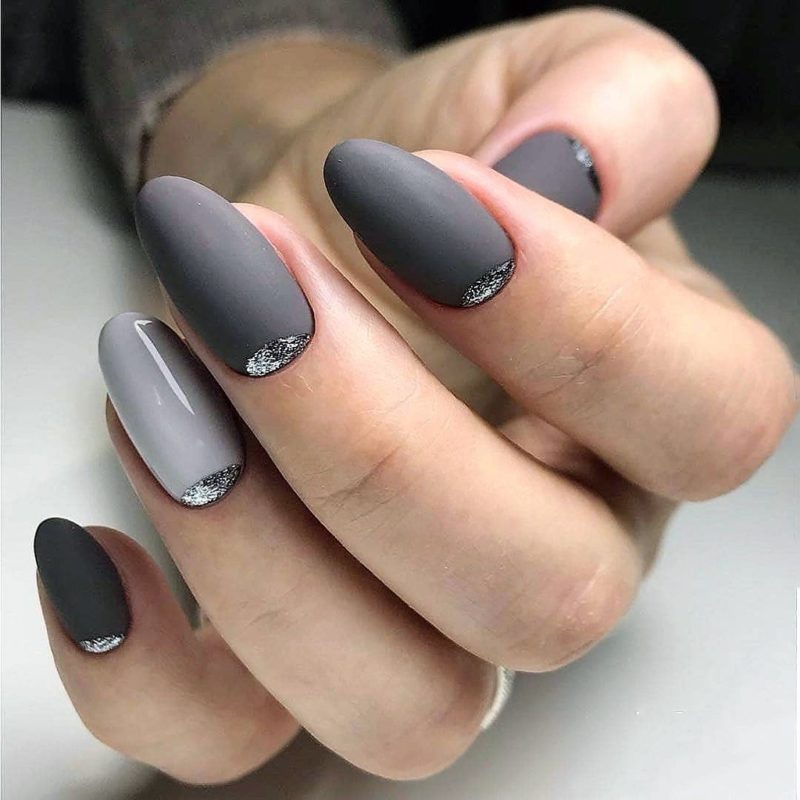 Очень сложно встретить даму, которая бы не любила французского маникюра. Ведь именно он делает любую форму ногтей ухоженной и свежей. Учитывая это, мастера предлагают не зацикливаться только на сочетании белого с прозрачным, серый френч вполне красиво смотрится. К примеру, фон может быть прозрачным, а край ногтя глянцевым. Также, базой может служить стойкий матовый, а края ногтя – декорирован блестками или насыщенным черным.