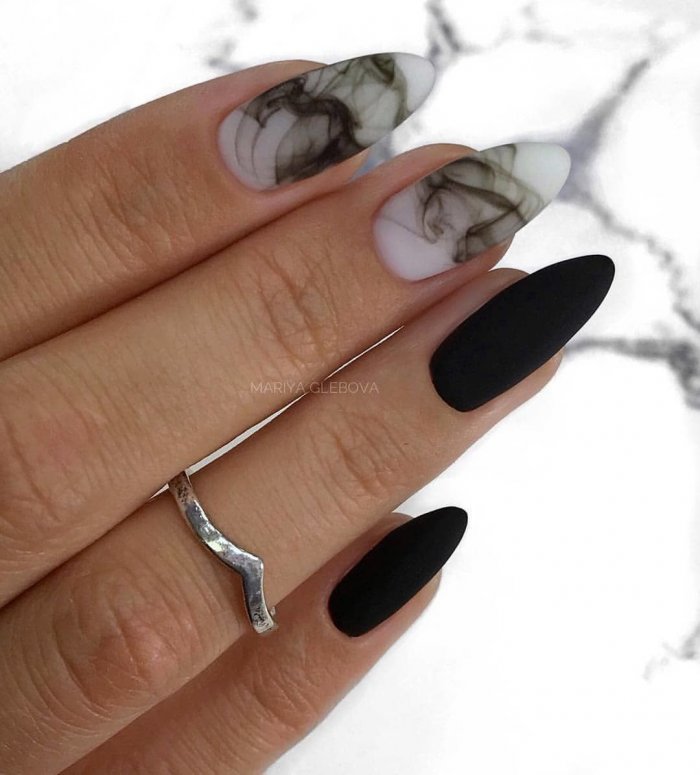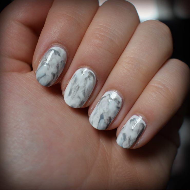 Мрамор достигается очень легко. Для этого нужно соединить белый с черным цветом. Такой дизайн маникюра свойственно выбирать спокойным и уравновешенным натурам.
