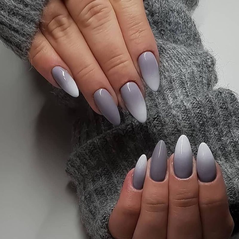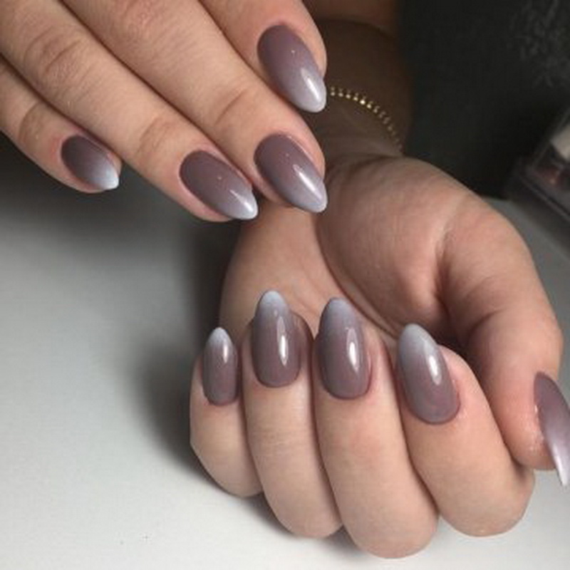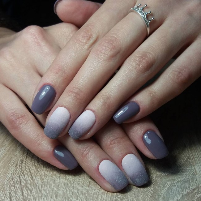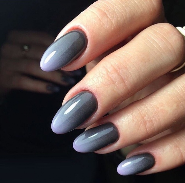 Омбре не является диковинкой, так как в моде уже несколько сезонов подряд. И не зря, так как маникюр просто сногсшибателен. По желанию клиента, переход из цвета в цвет создается разными способами. К примеру, можно аккуратно совмещать холодные тона с нежными, переходить от темного-серого к светлому, или же выходить за рамки серого и включать в градиент темные тона, такие как черный или фиолетовый.