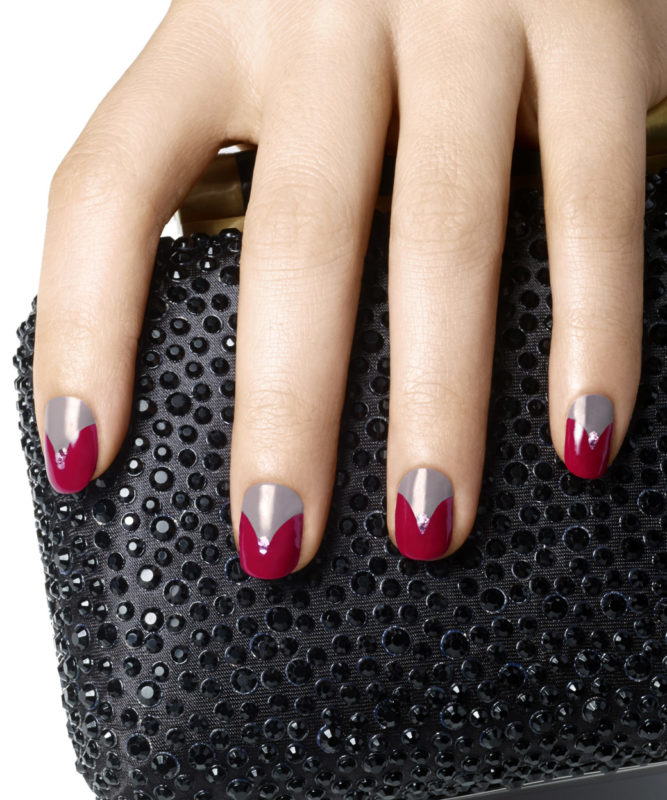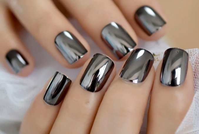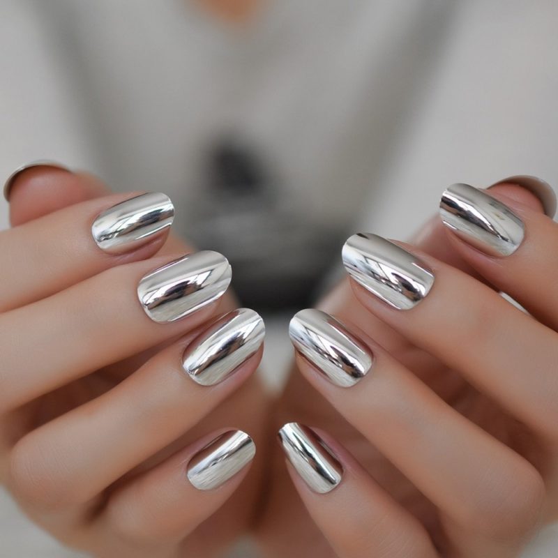 Данный вид маникюра подходит девушкам с характером. Он достигается благодаря серебристой втирке. Тогда сталь будет просто сиять на ногтях. Яркие личности могут создавать таким образом маникюр на всех ногтях и мерцать стальными бликами, отражая окружающий цвет.