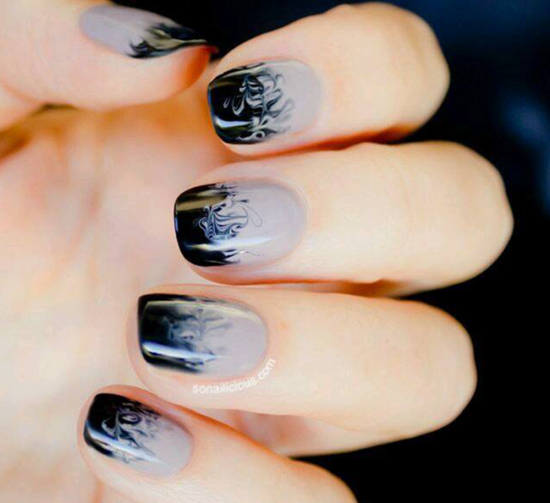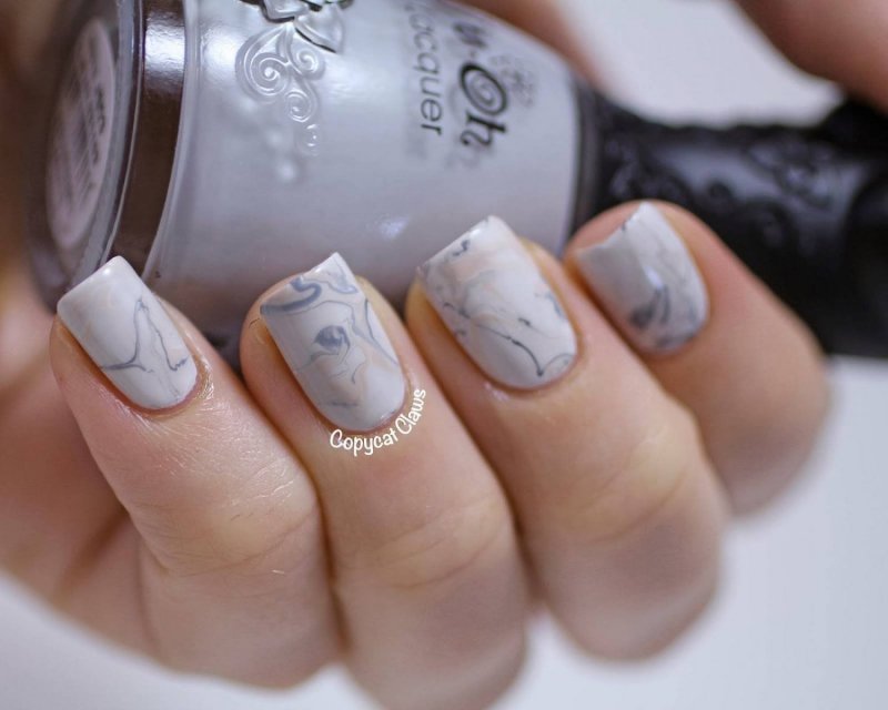 Для того чтобы создать такой дизайн, серый лак является основой, чтобы сделать разводы, берется другой акриловый оттенок. Чаще всего это белый, так как он идеально с ним гармонирует, или розовый. Также можно сделать комбинацию наоборот – основу сделать белой, а разводы – серыми, или же воспользоваться монохромными цветами, чтобы разводы были яркими.