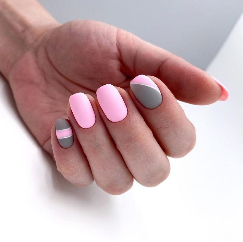 Обратите внимание! Розово-серые ноготки могут быть не только нежными, но и яркими. Они выглядят насыщенно и привлекательно в таком дизайне.