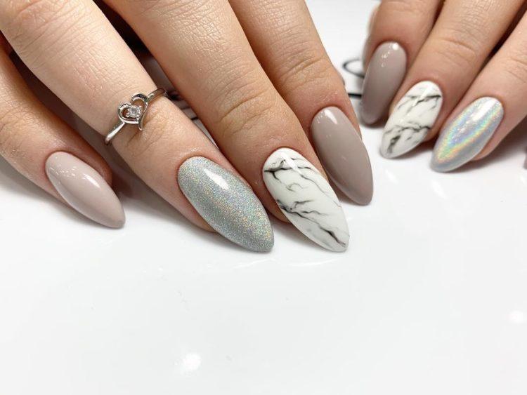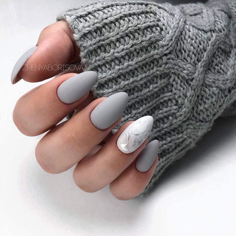 С приходом в моду капсульного гардероба, где модницы отдают предпочтение базовым вещам, серый дизайн маникюра, который идеально сочетается с мрамором, серебром, графитом и сталью, выглядит очень стильно.