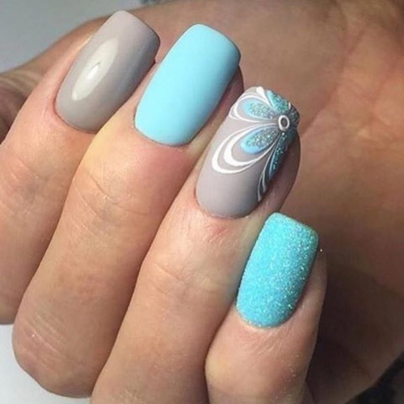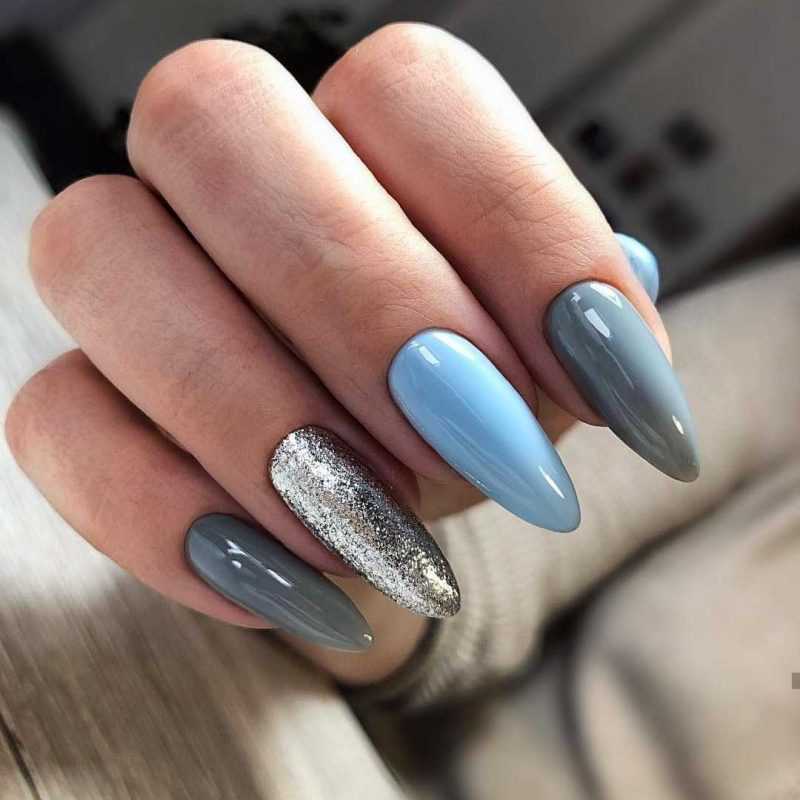 Эффект омбре также получится тогда, когда мастер сделает переход от серебряного лака к серо-голубому. Но чтобы не перегружать весь дизайн, такое действие рекомендуется сделать на нескольких ноготках.