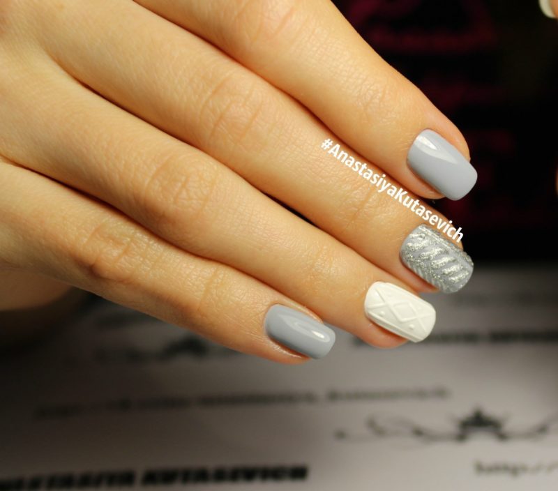 Можно, по желанию, играть цветами, использовать для выделения белый гель-лак. Серый дизайн можно украсить серебряным хромированным блеском. В помощь мастеру придут также хроматик, жидкий бриллиант или маникюрную фольгу.