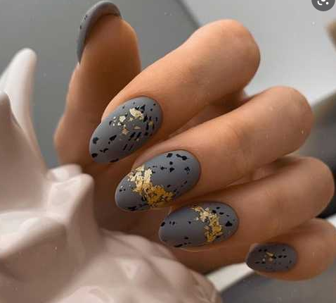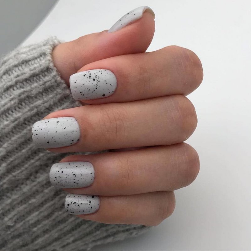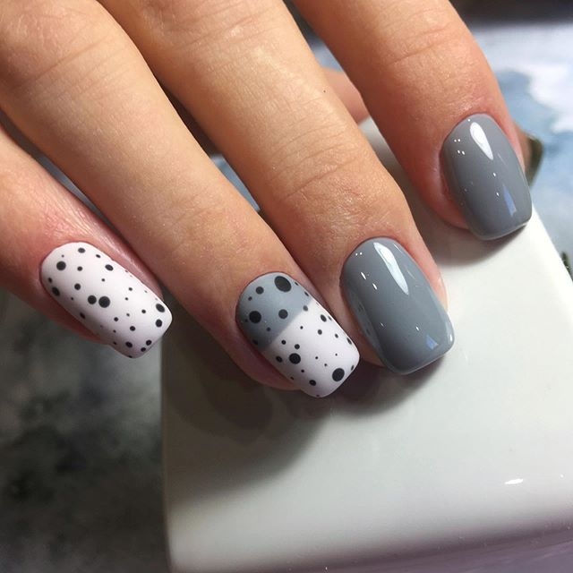 Нежная композиция, в которой серая основа покрыта белыми или светло-серыми пятнышками, которые напоминают рисунок, изображенный на перепелиных яйцах. Ее выбирают смелые личности, юные модницы, которые не боятся экспериментов. Главное, текстура точек должна быть матовой или акриловой, чтобы эффект был более выразительным.