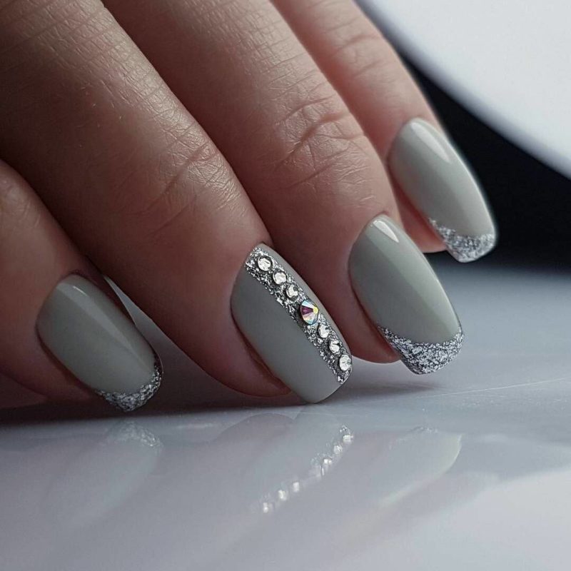 Ногти серые с блестками, стразами