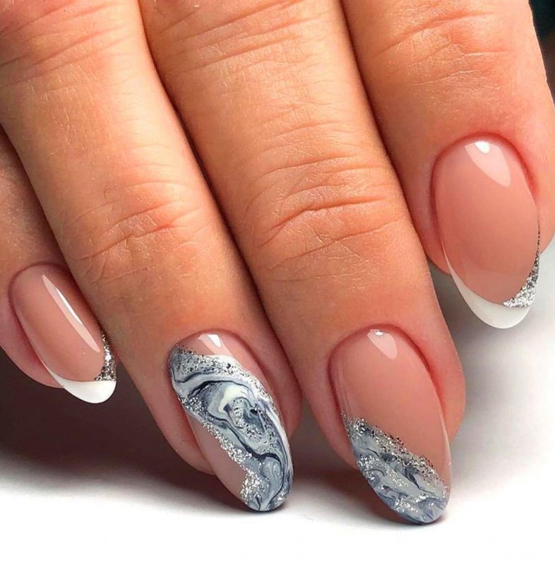 Дизайн еще именуют «лунным». Несмотря на свою элегантность, его нельзя назвать вычурным. В зависимости от количества серебристых вставок, маникюр подойдет и для праздников, и для повседневной жизни.