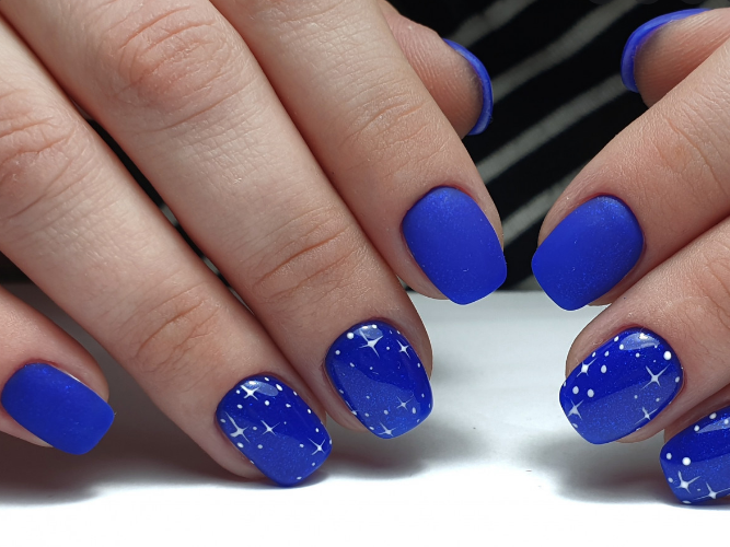 Синий матовый маникюр в трендах уже не первый год. Он актуален и летом, и зимой. Важно подобрать подходящий цвет и дизайн. Обыграв правильно шеллак можно получить красивый лаконичный или неординарный декор маникюра на любое время года.