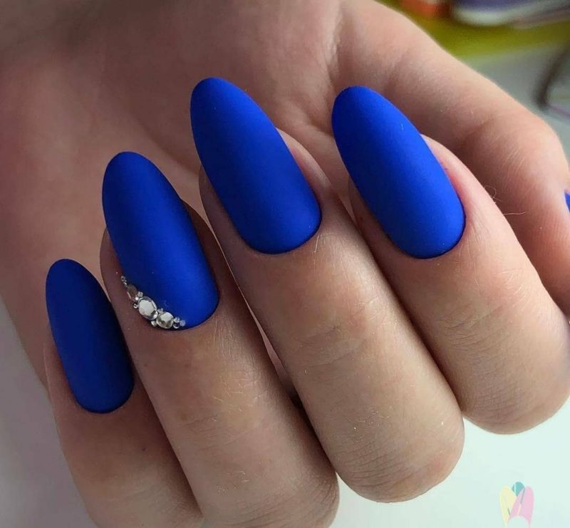 - чтобы не заглушить роскошь матовой синевы, не стоит декорировать каждый ноготок. Уместнее выделить 1-2.