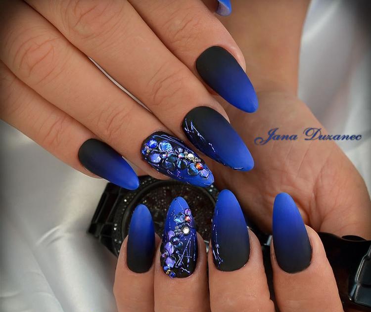 Драматично выглядит маникюр, окрашенные матовым синим и черным цветом. Эффектный маникюр получится, если создать эффект омбре. Блестящий декор разбавит темный фон. Это могут быть стразы, оттиски фольги, рисунки золотом или серебром.