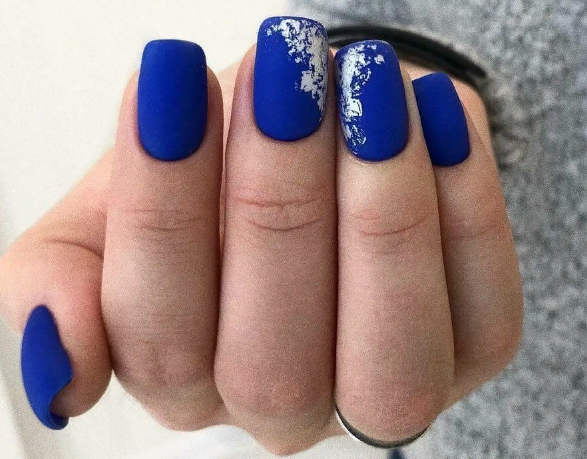 Матовое серебро в синем всегда выигрышно смотрится в сочетании с темными расцветками. Особенно актуален такой дизайн в зимний новогодний период. Серебряным можно нарисовать вензеля, звёзды, снежинки. Блестящим делают свободный край во френче или выделяют «лунки». Уместна в декоре серебряная фольга и тонкие полосы, абстракция, «рептилия» и анималистика.