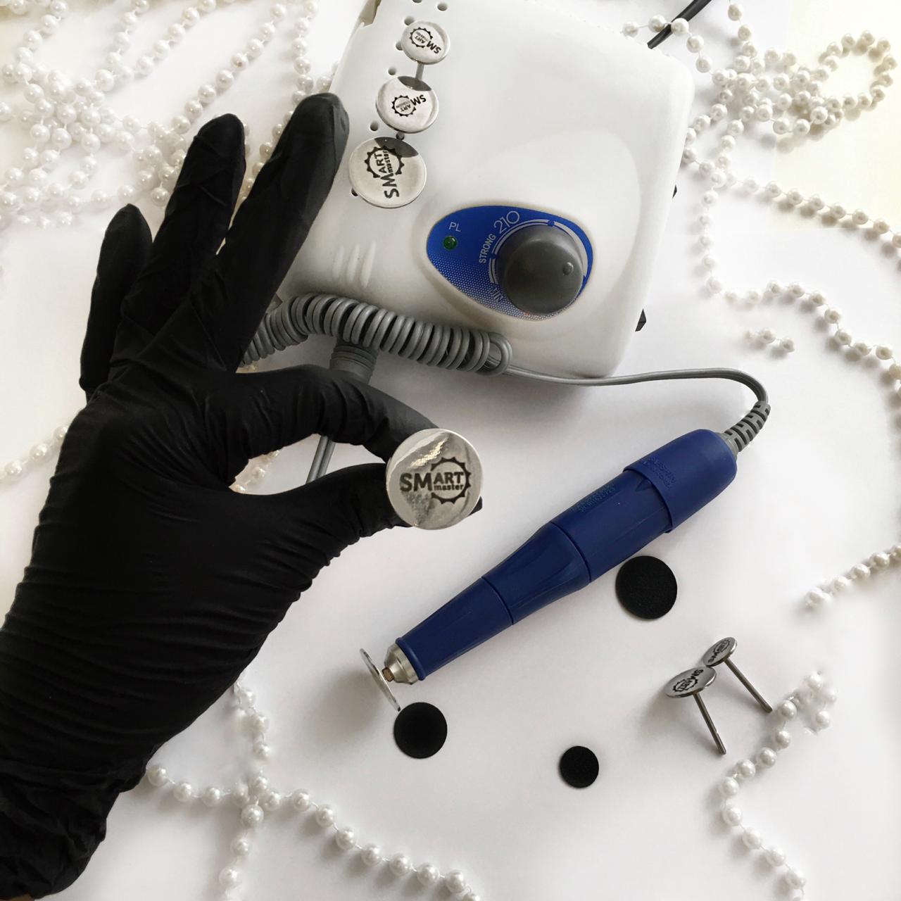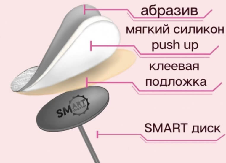 - на аппарат для маникюра smart master одевается специальный диск, на котором закрепляется абразивный файл необходимой жёсткости и нужного диаметра. При этом не используют никаких увлажнителей — сеанс проводят исключительно на сухую кожу;