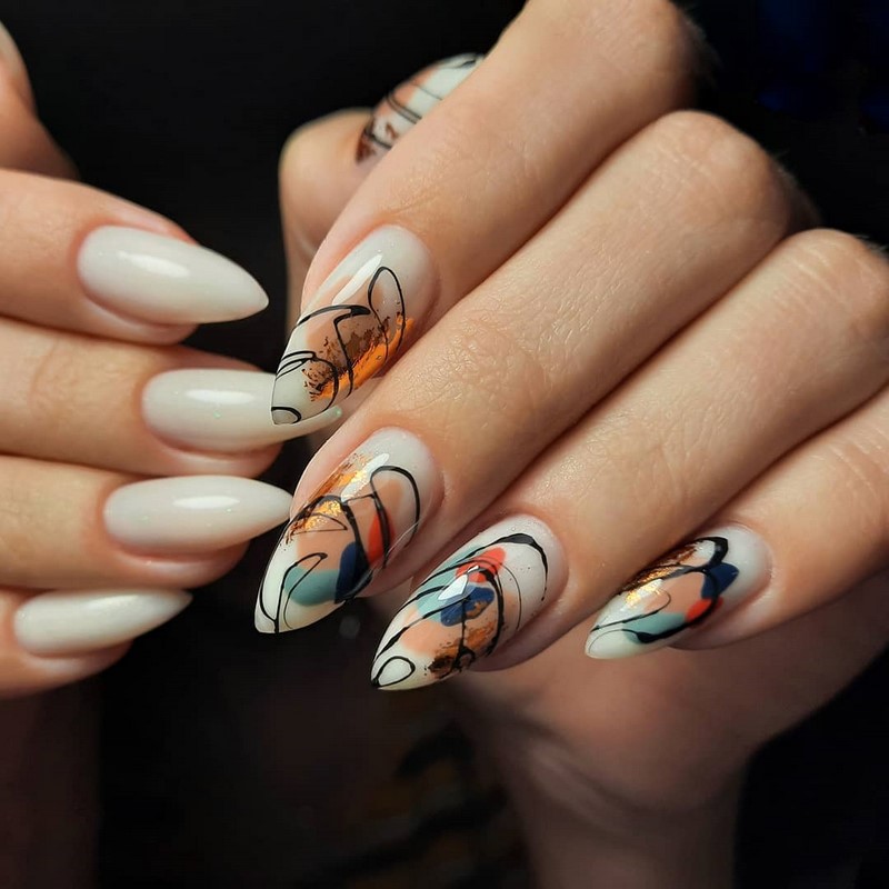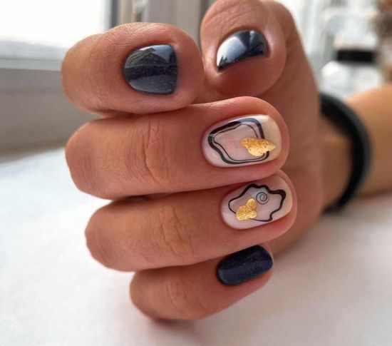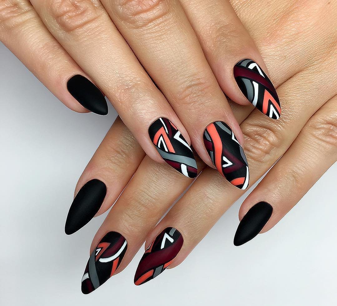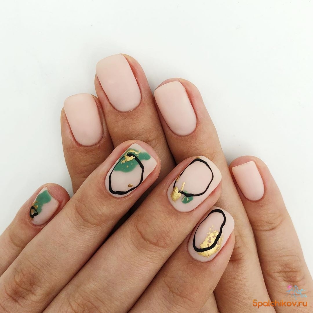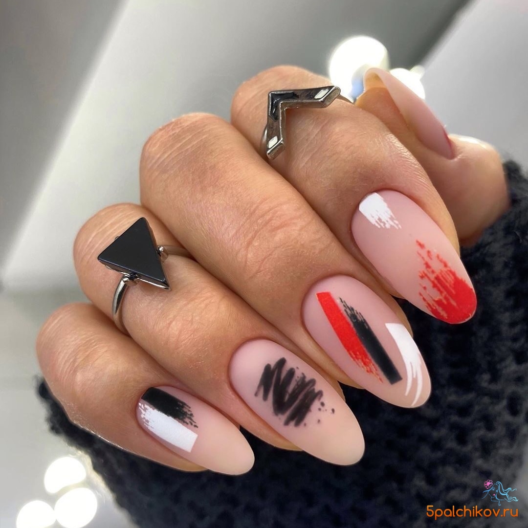 Абстрактные рисунки давно и прочно занимают лидирующие позиции в вопросе создания стильного маникюра. Модный эффект дает сочетание с матовой текстурой или дизайном разные руки. Но не стоит забывать и о глянце, который усиливает эффект от сложного рисунка. Дополнить можно стразами, серебряными или золотыми лаками, глиттером. Уместно будет смотреться фольга, с помощью которой можно создавать дополнительные цветовые блоки.