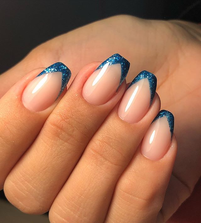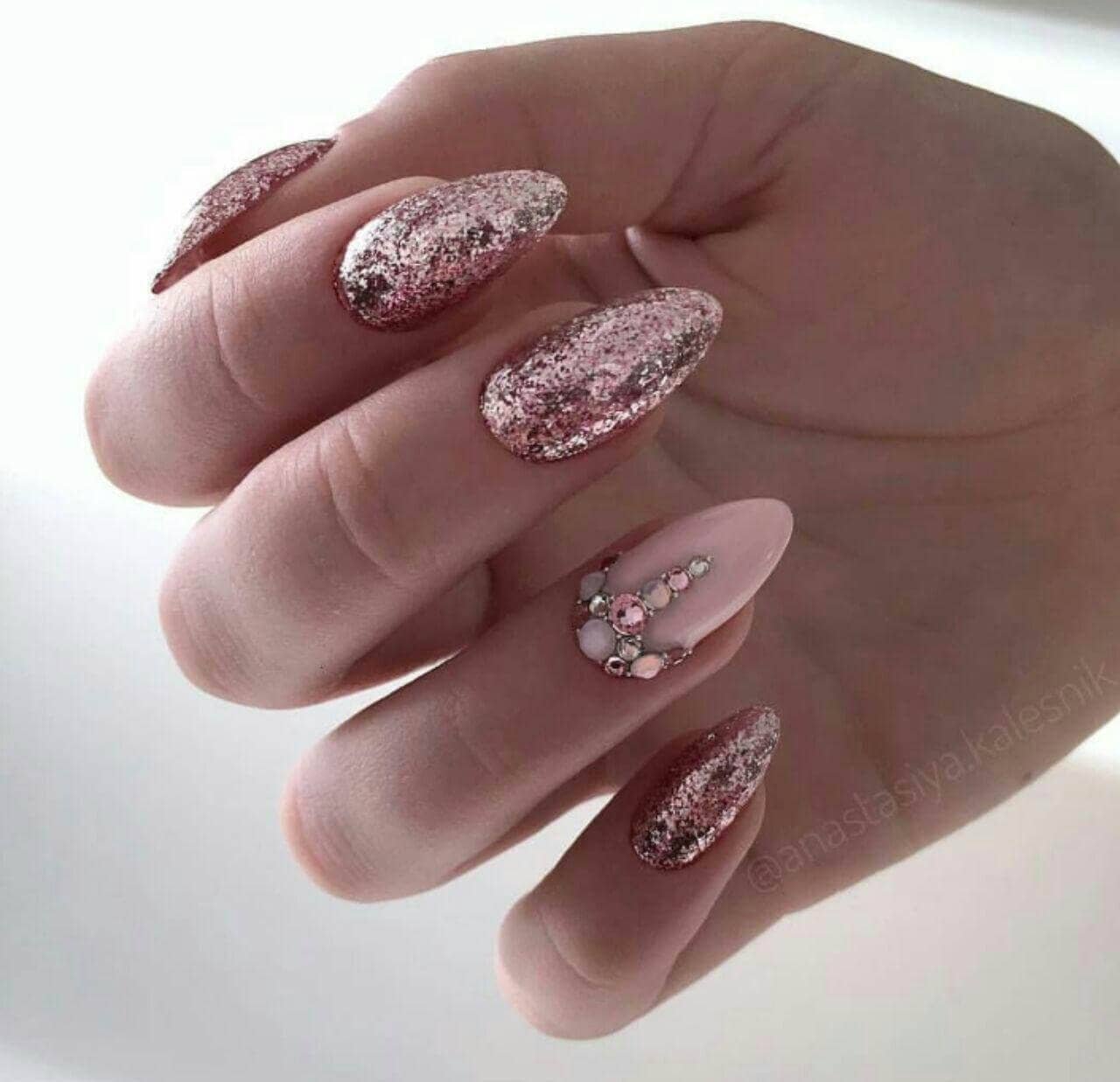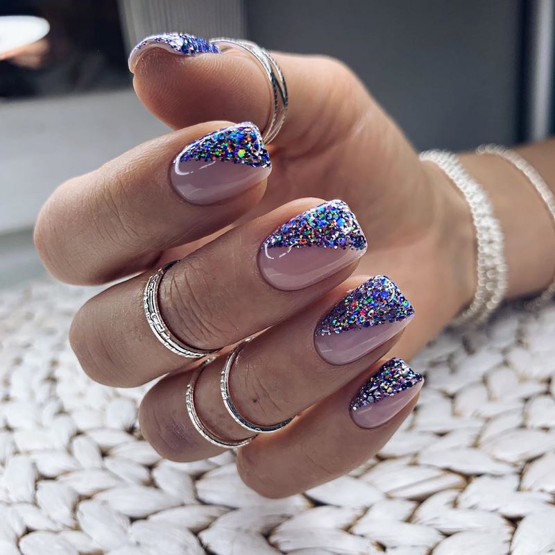 Стильный маникюр с блестками требует умеренности. Если вы решили сделать блестящими все ноготки, глиттер должен быть с мельчайшими частичками. Чем крупнее будут блестки, тем меньше должен быть акцент. Например, таким образом можно оформить мизинец.