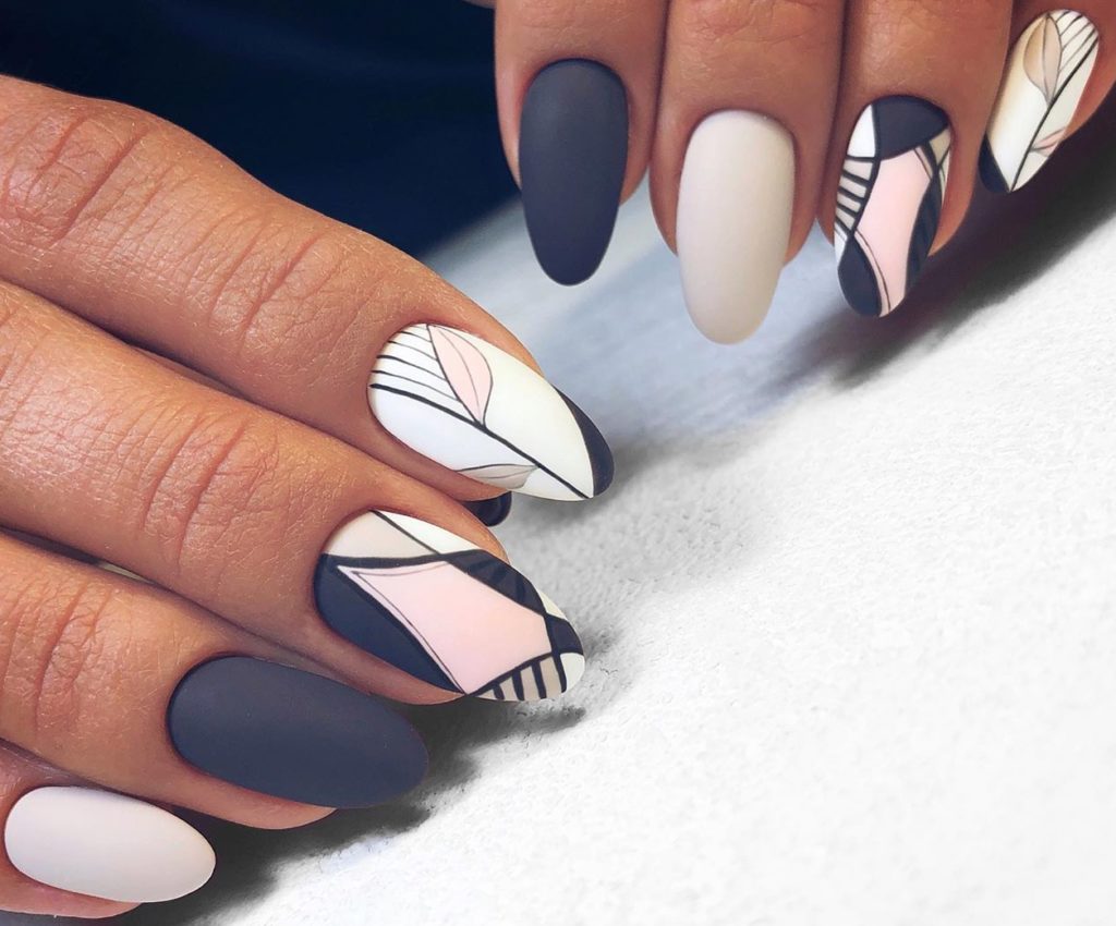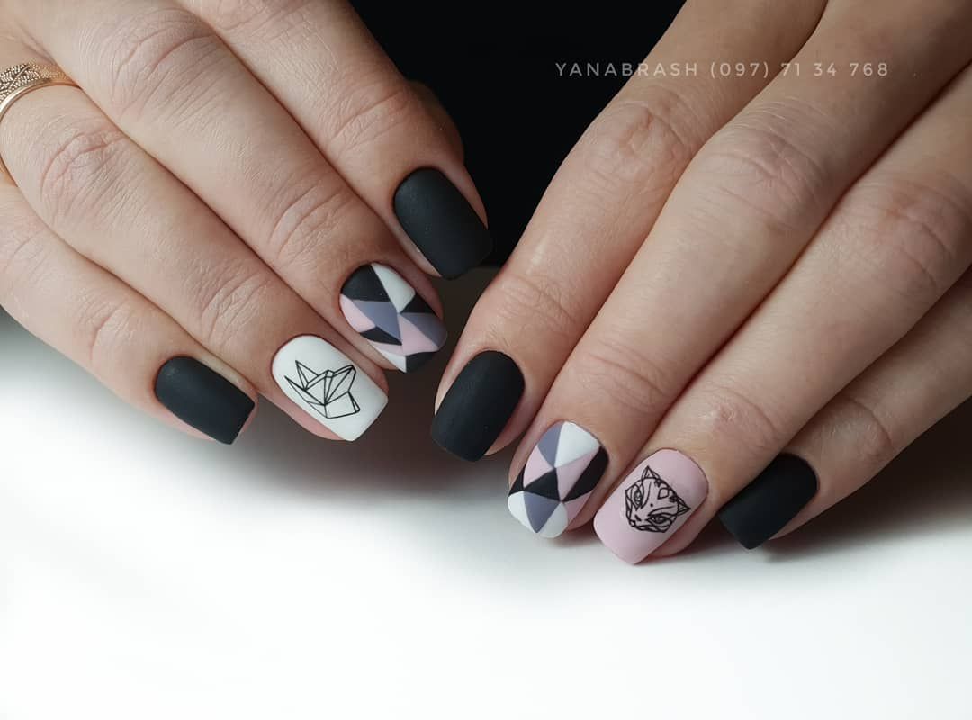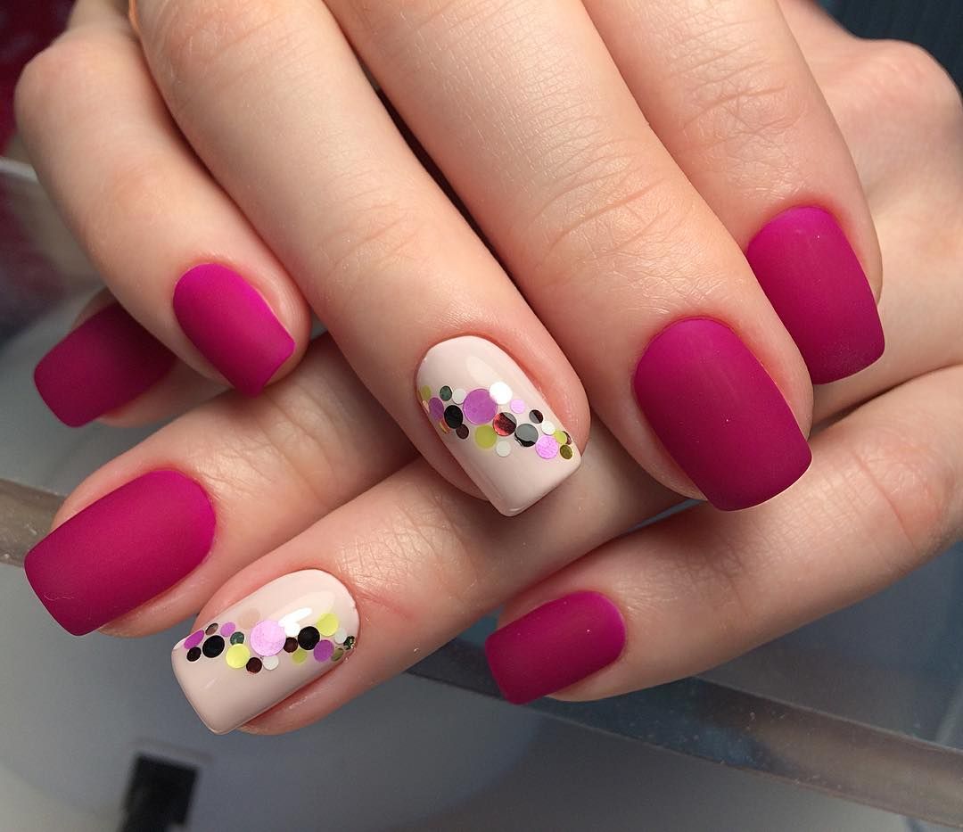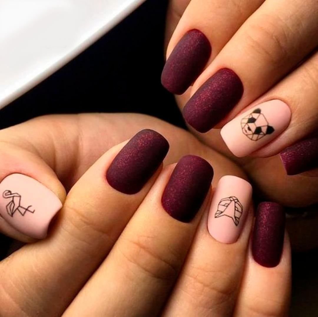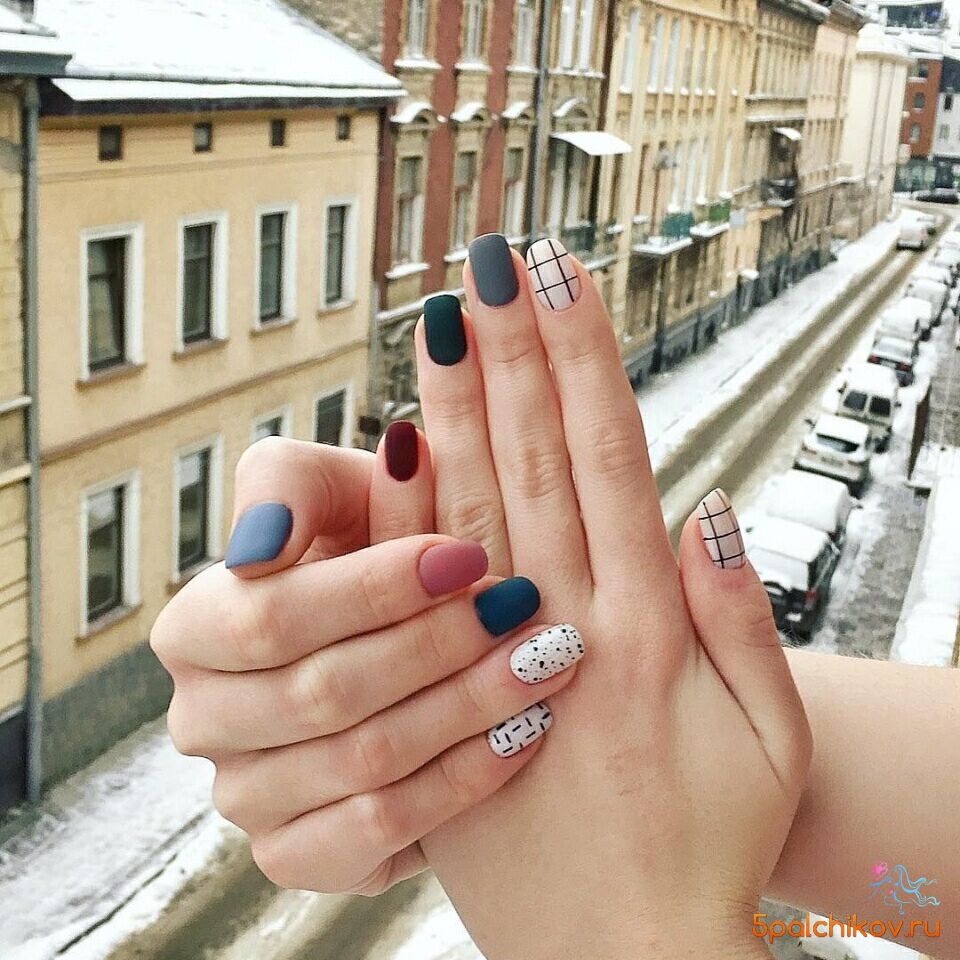 Снова на пике популярности дизайн разные руки. Но в этом сезоне мастера предлагают сочетать его с матовым топом. Строгих правил нет. Стильный маникюр вы создаете сами. Например, ногти одной руки окрашены в один цвет лака, на второй можно выбрать контрастный оттенок. Еще один вариант — дополнить дизайн рисунками. Но не стоит делать их много. Просто сделайте акцент на одном пальце каждой руки. При этом рисунки можно разместить друг напротив друга. Например, на мизинцах.