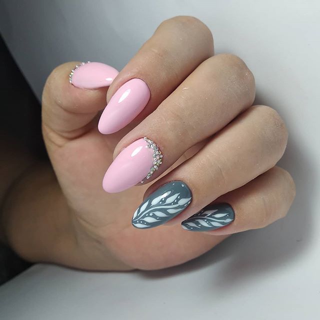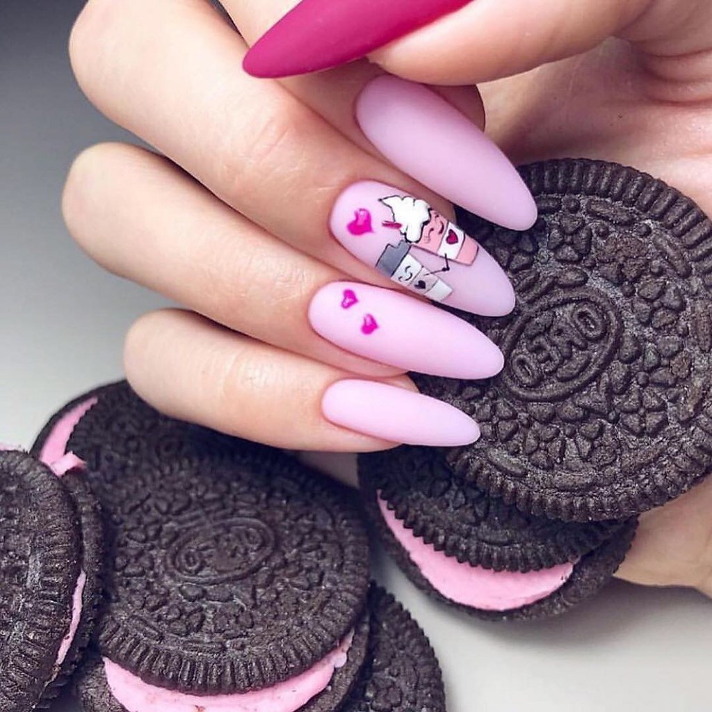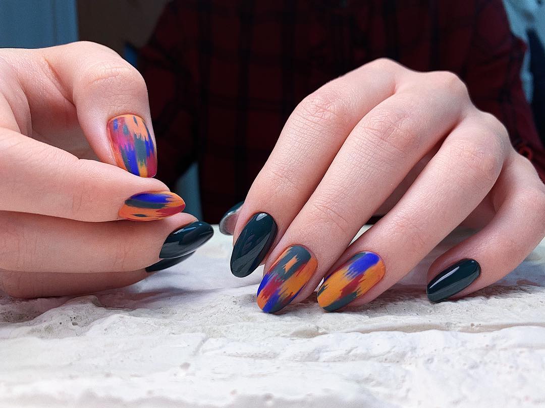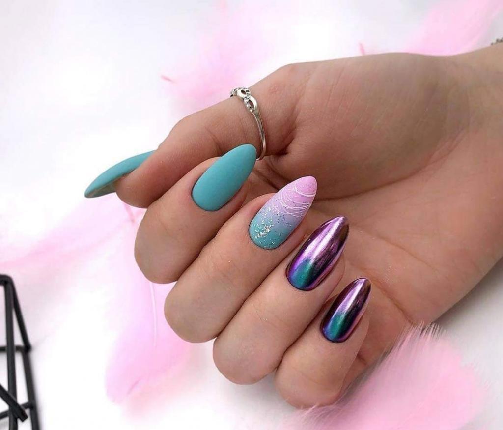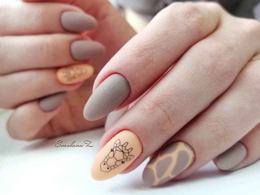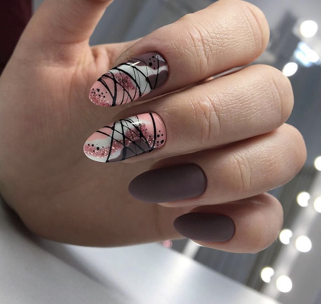 Снова на пике популярности дизайн разные руки. Но в этом сезоне мастера предлагают сочетать его с матовым топом. Строгих правил нет. Стильный маникюр вы создаете сами. Например, ногти одной руки окрашены в один цвет лака, на второй можно выбрать контрастный оттенок. Еще один вариант — дополнить дизайн рисунками. Но не стоит делать их много. Просто сделайте акцент на одном пальце каждой руки. При этом рисунки можно разместить друг напротив друга. Например, на мизинцах.