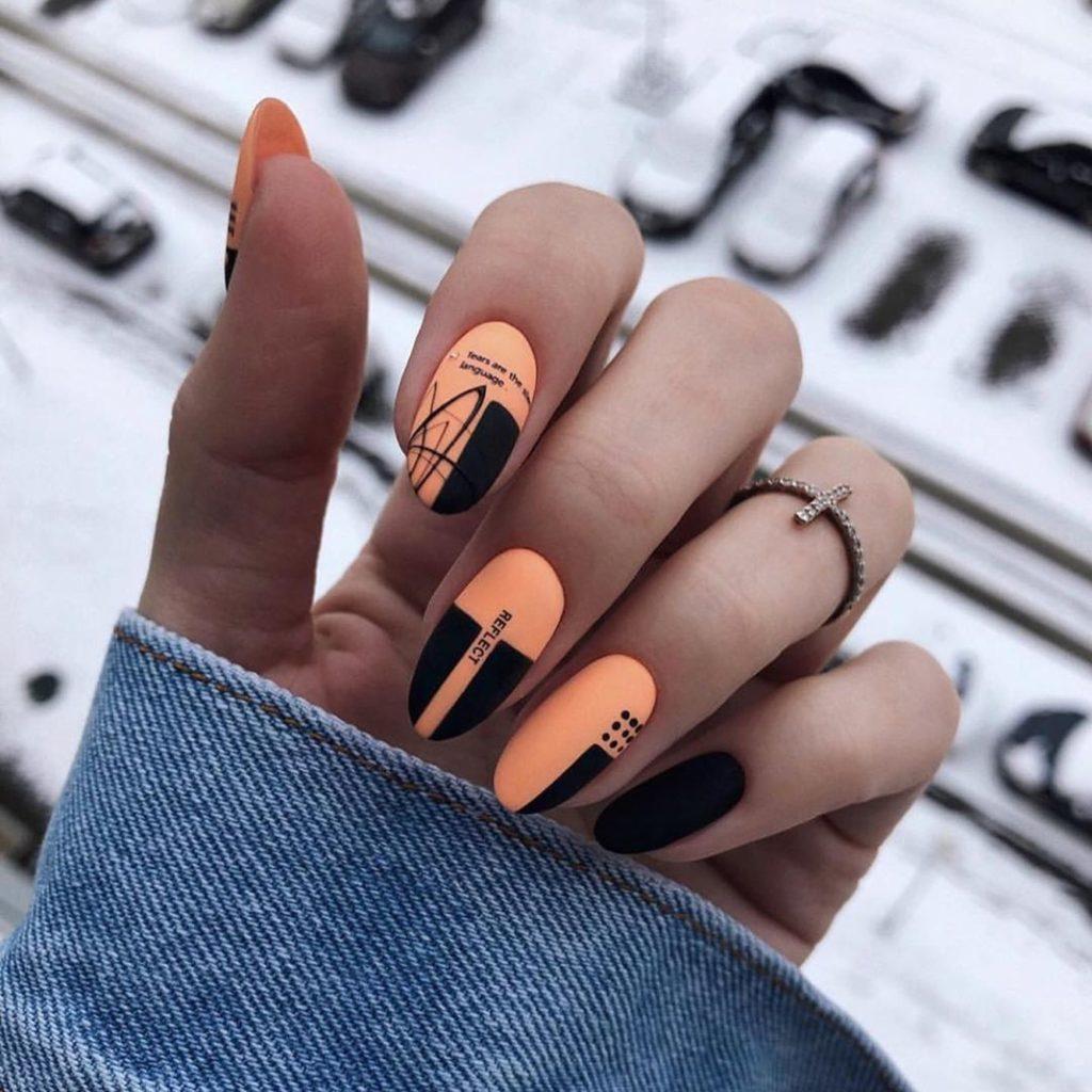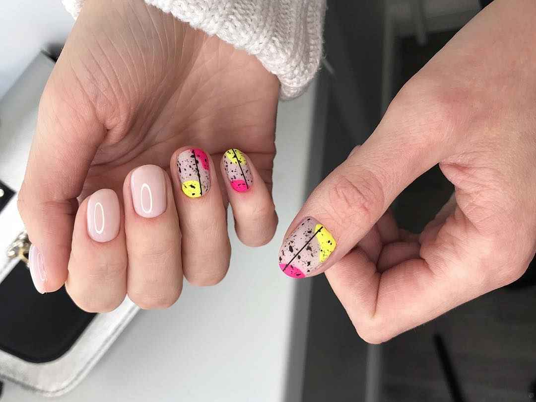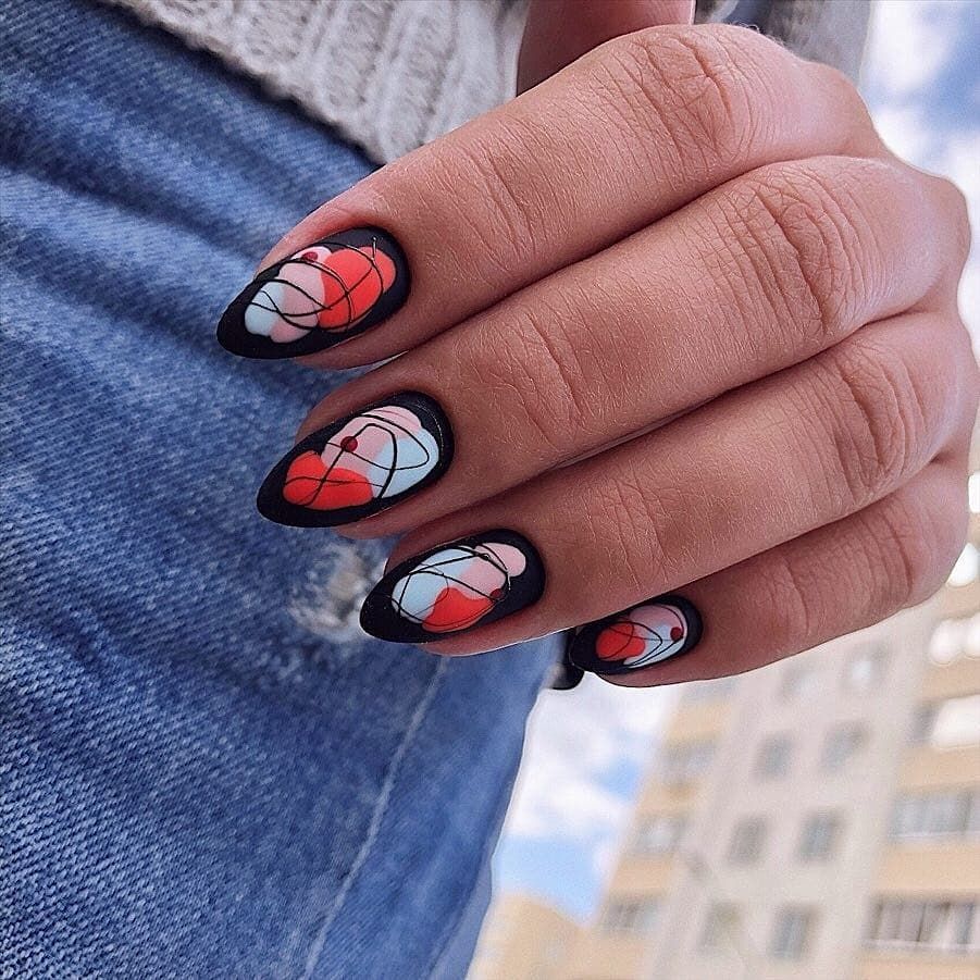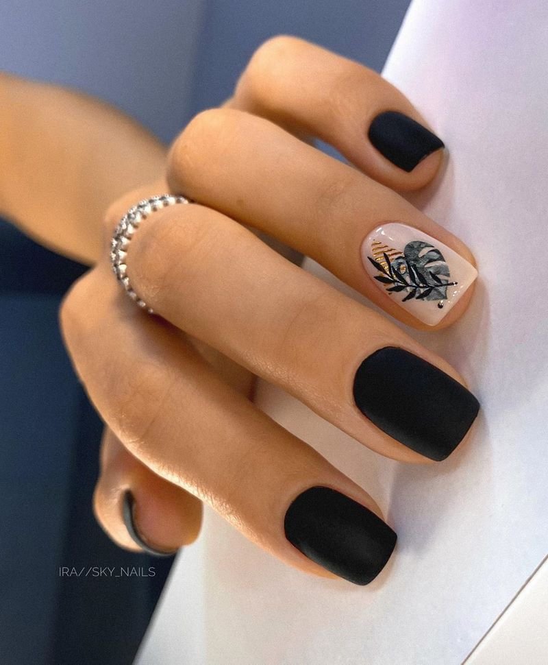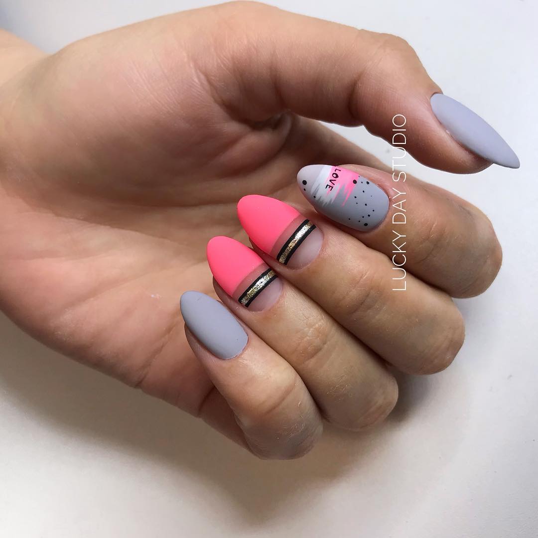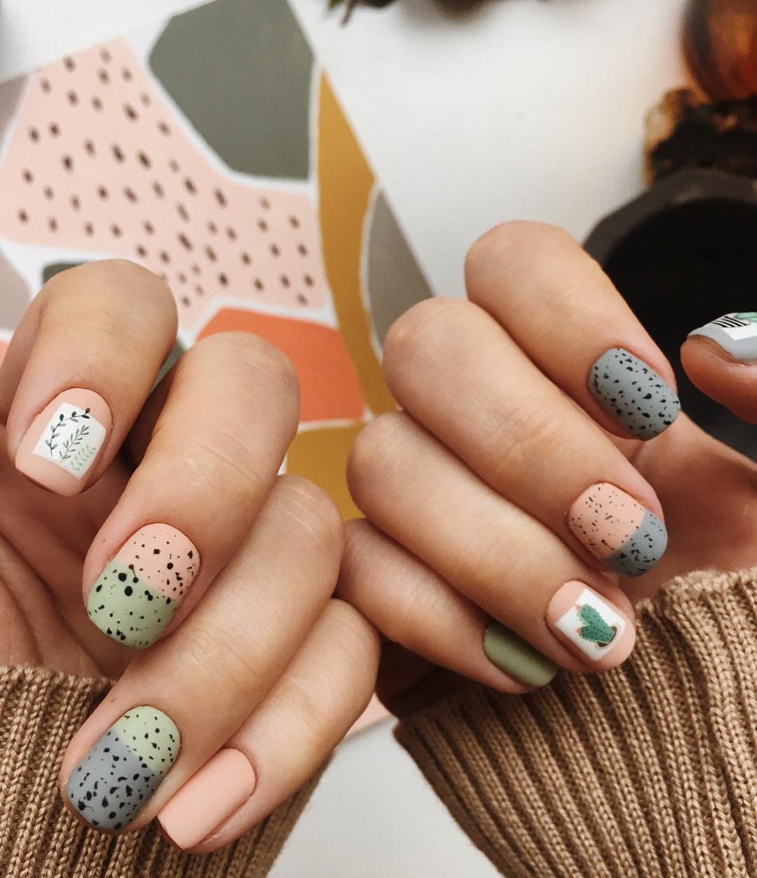 Снова на пике популярности дизайн разные руки. Но в этом сезоне мастера предлагают сочетать его с матовым топом. Строгих правил нет. Стильный маникюр вы создаете сами. Например, ногти одной руки окрашены в один цвет лака, на второй можно выбрать контрастный оттенок. Еще один вариант — дополнить дизайн рисунками. Но не стоит делать их много. Просто сделайте акцент на одном пальце каждой руки. При этом рисунки можно разместить друг напротив друга. Например, на мизинцах.