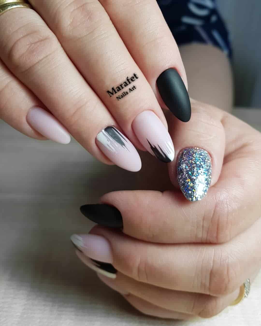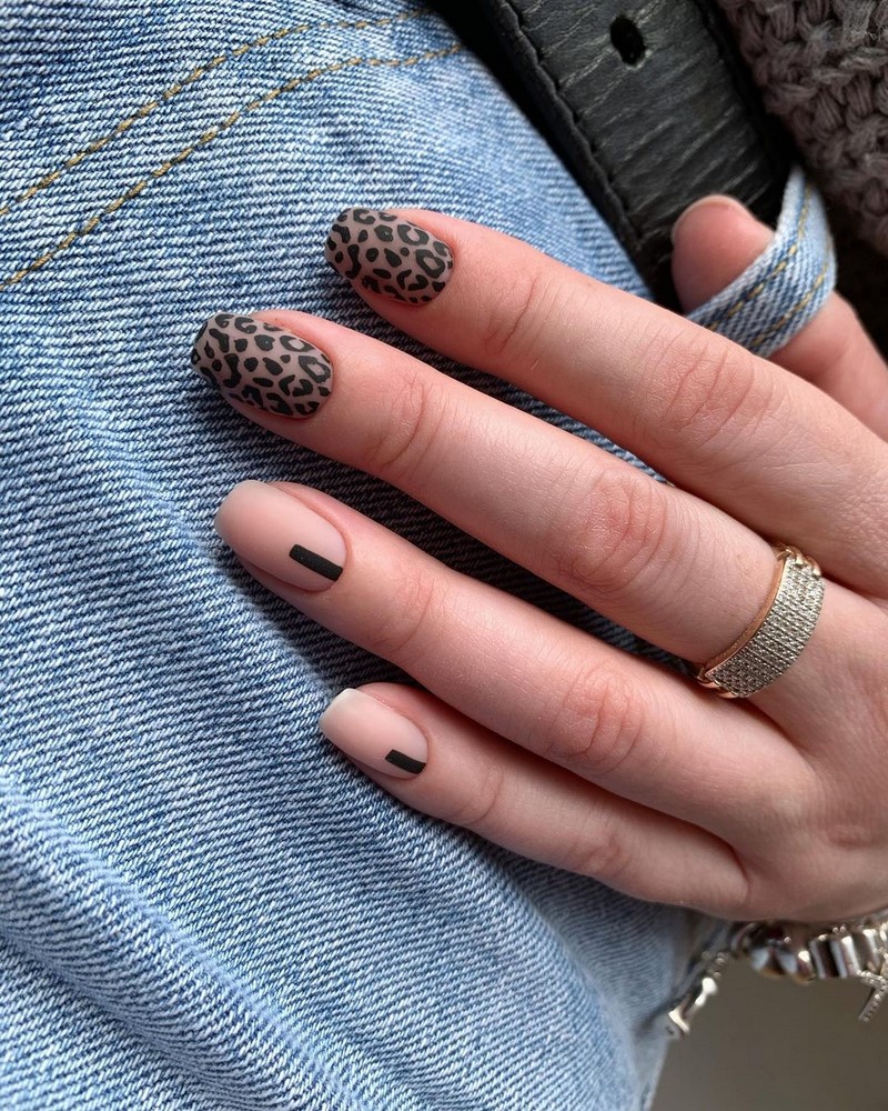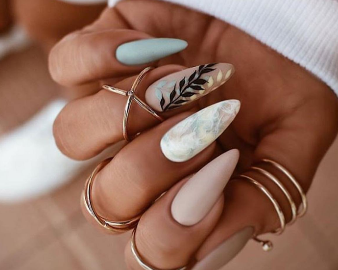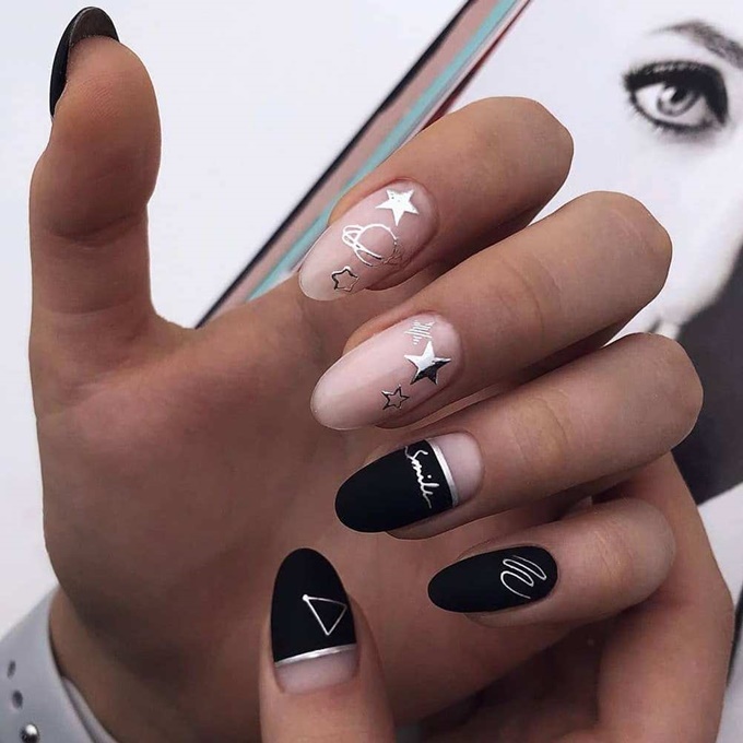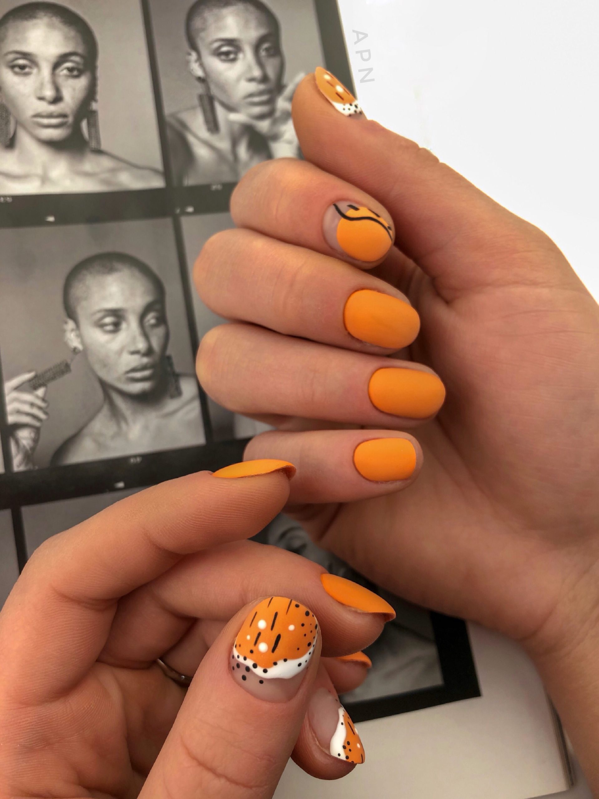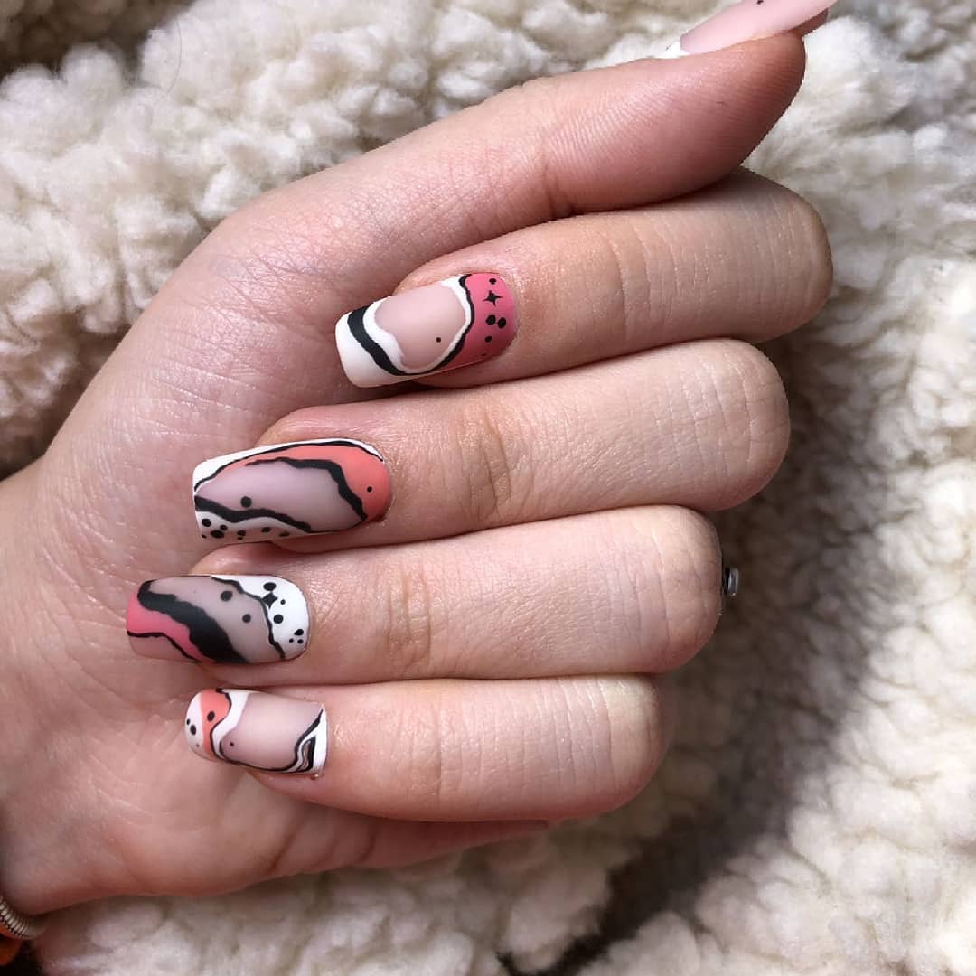 Снова на пике популярности дизайн разные руки. Но в этом сезоне мастера предлагают сочетать его с матовым топом. Строгих правил нет. Стильный маникюр вы создаете сами. Например, ногти одной руки окрашены в один цвет лака, на второй можно выбрать контрастный оттенок. Еще один вариант — дополнить дизайн рисунками. Но не стоит делать их много. Просто сделайте акцент на одном пальце каждой руки. При этом рисунки можно разместить друг напротив друга. Например, на мизинцах.