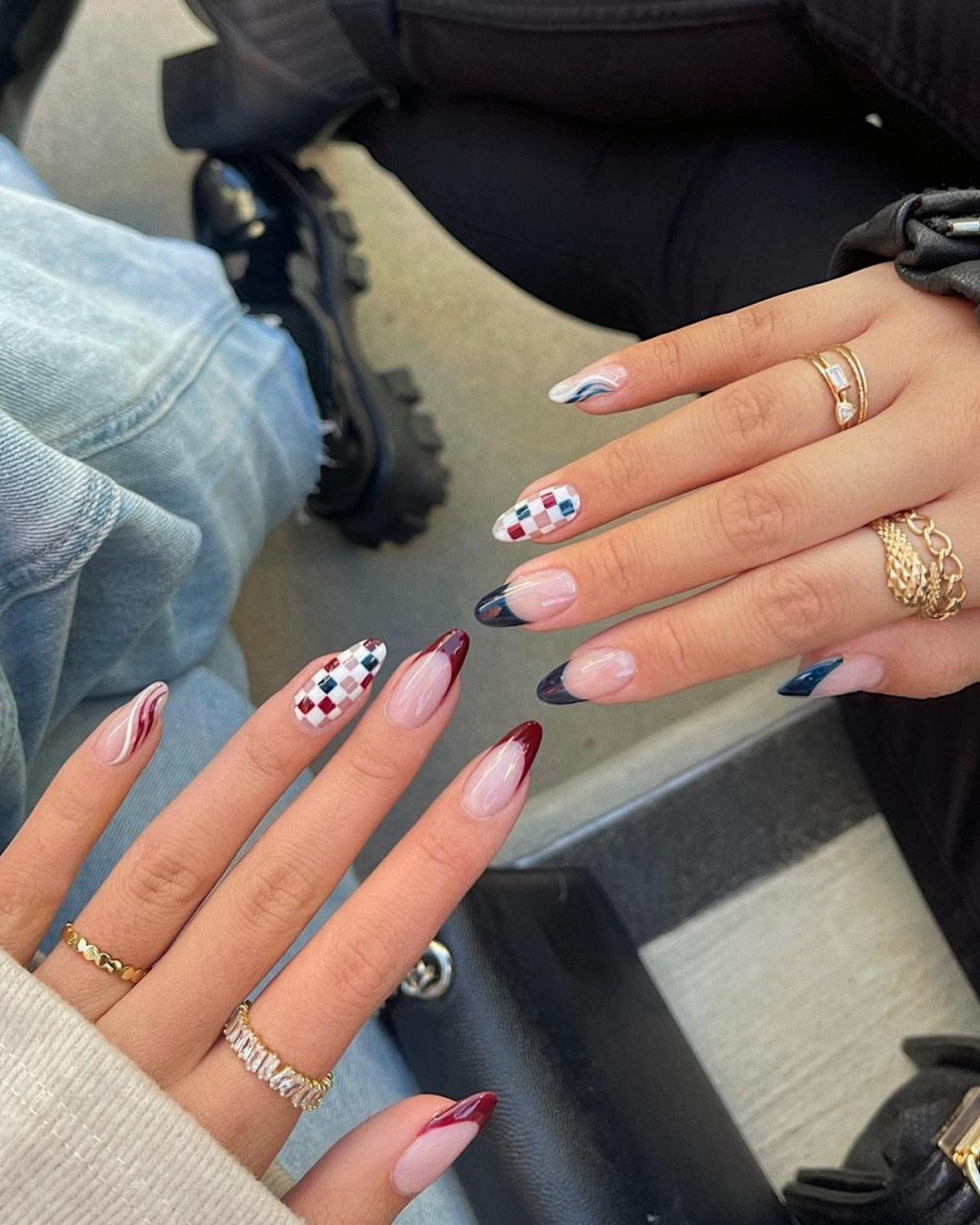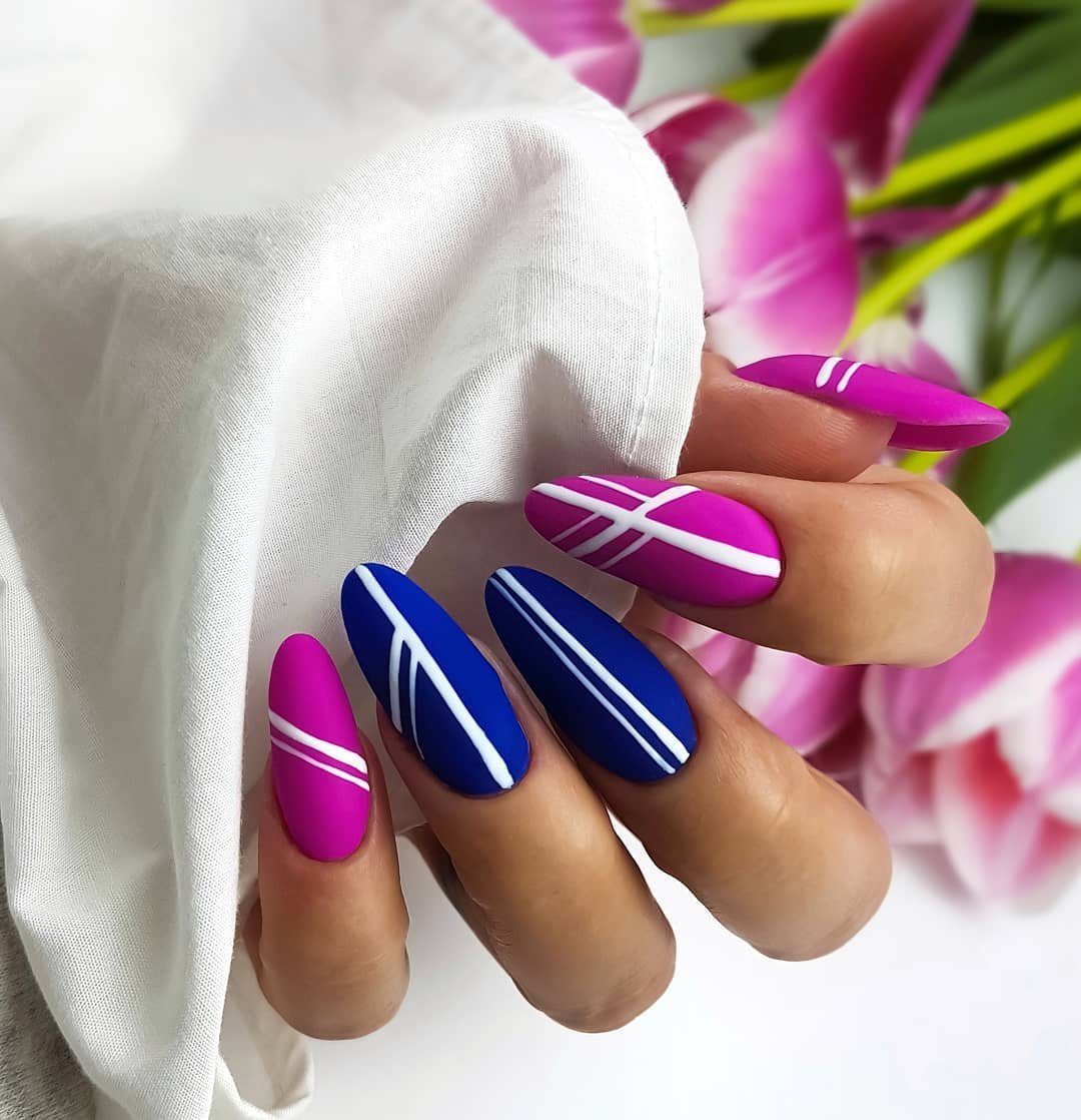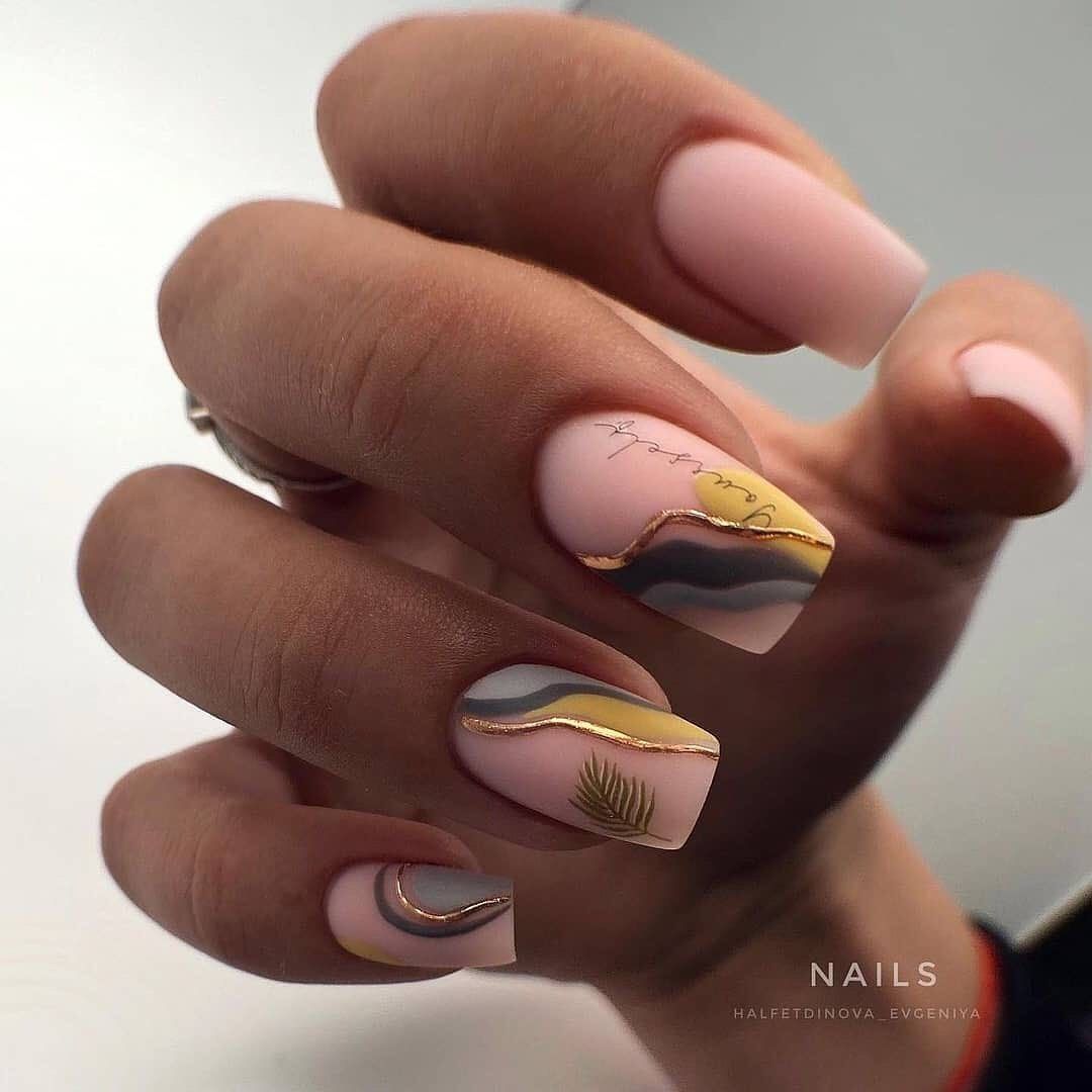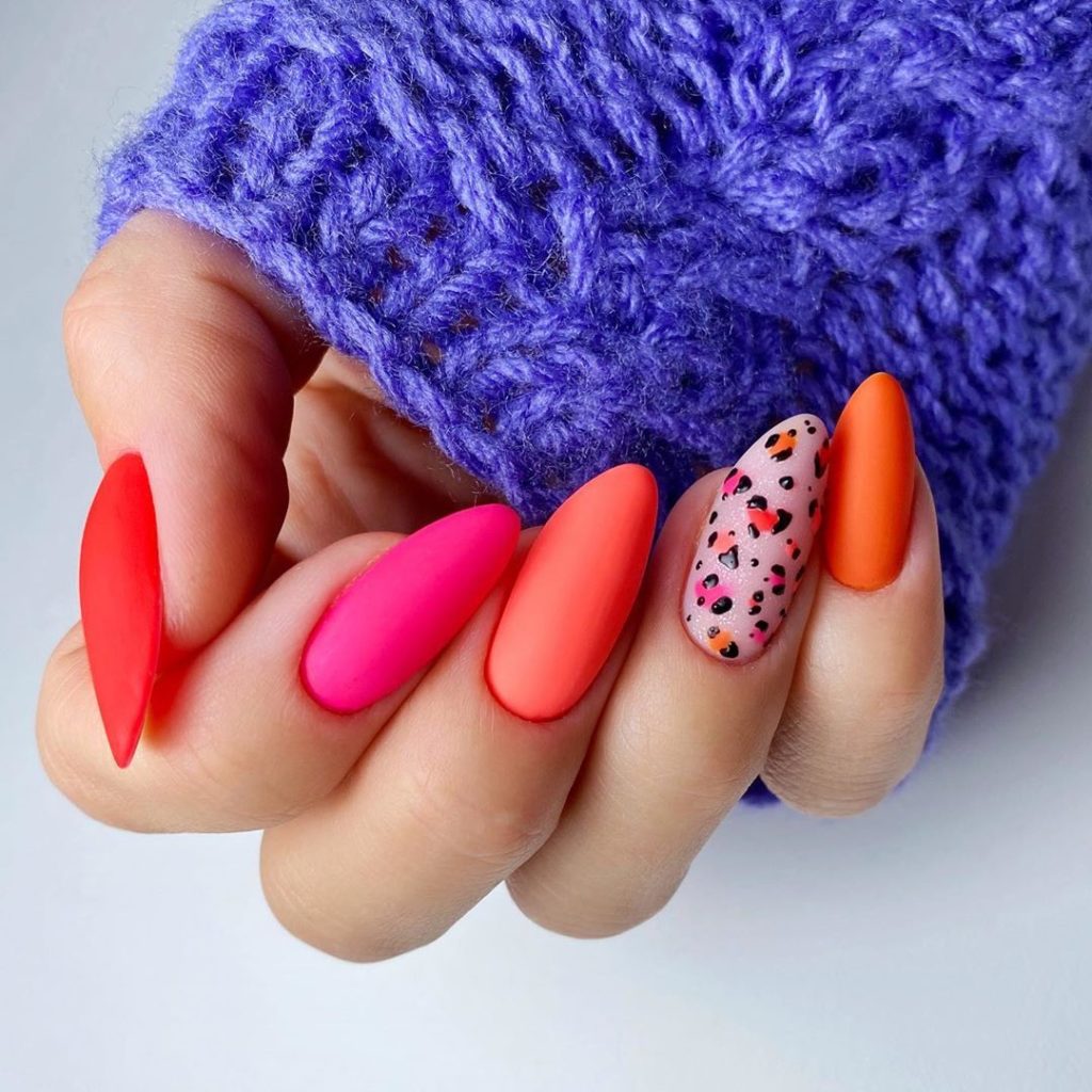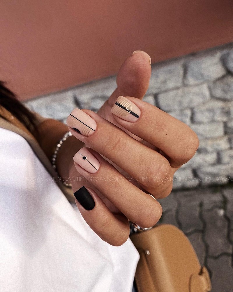 Снова на пике популярности дизайн разные руки. Но в этом сезоне мастера предлагают сочетать его с матовым топом. Строгих правил нет. Стильный маникюр вы создаете сами. Например, ногти одной руки окрашены в один цвет лака, на второй можно выбрать контрастный оттенок. Еще один вариант — дополнить дизайн рисунками. Но не стоит делать их много. Просто сделайте акцент на одном пальце каждой руки. При этом рисунки можно разместить друг напротив друга. Например, на мизинцах.