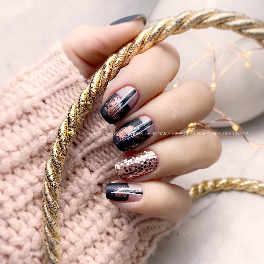 Стразы и блестки — обязательный атрибут праздничного маникюра. Для стильного дизайна в этом сезоне мастера рекомендуют отказаться от обилия камней и сделать небольшие акценты — на всех ноготках или только одном. При этом рекомендуется выбирать стразы в тон базового лака.