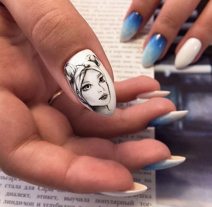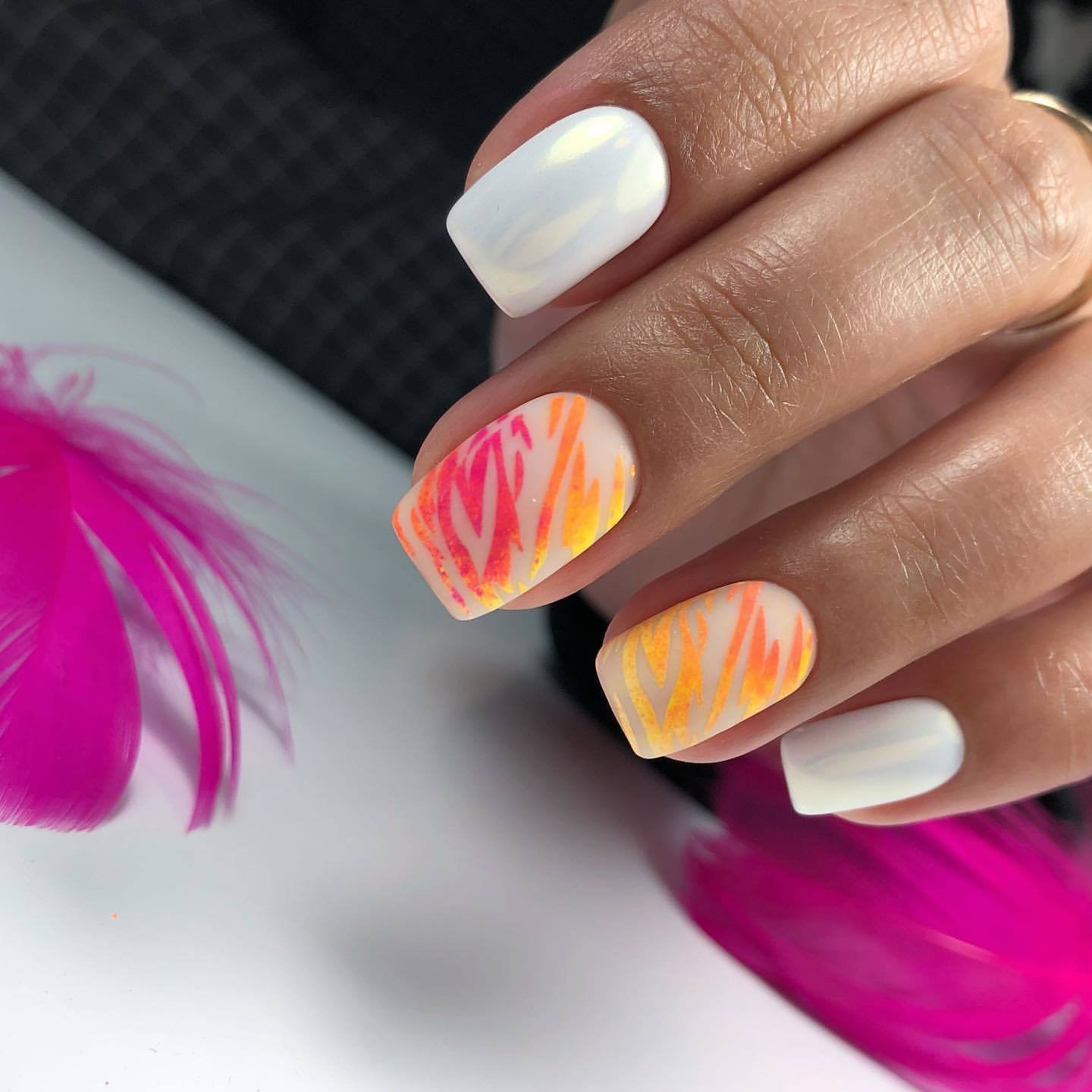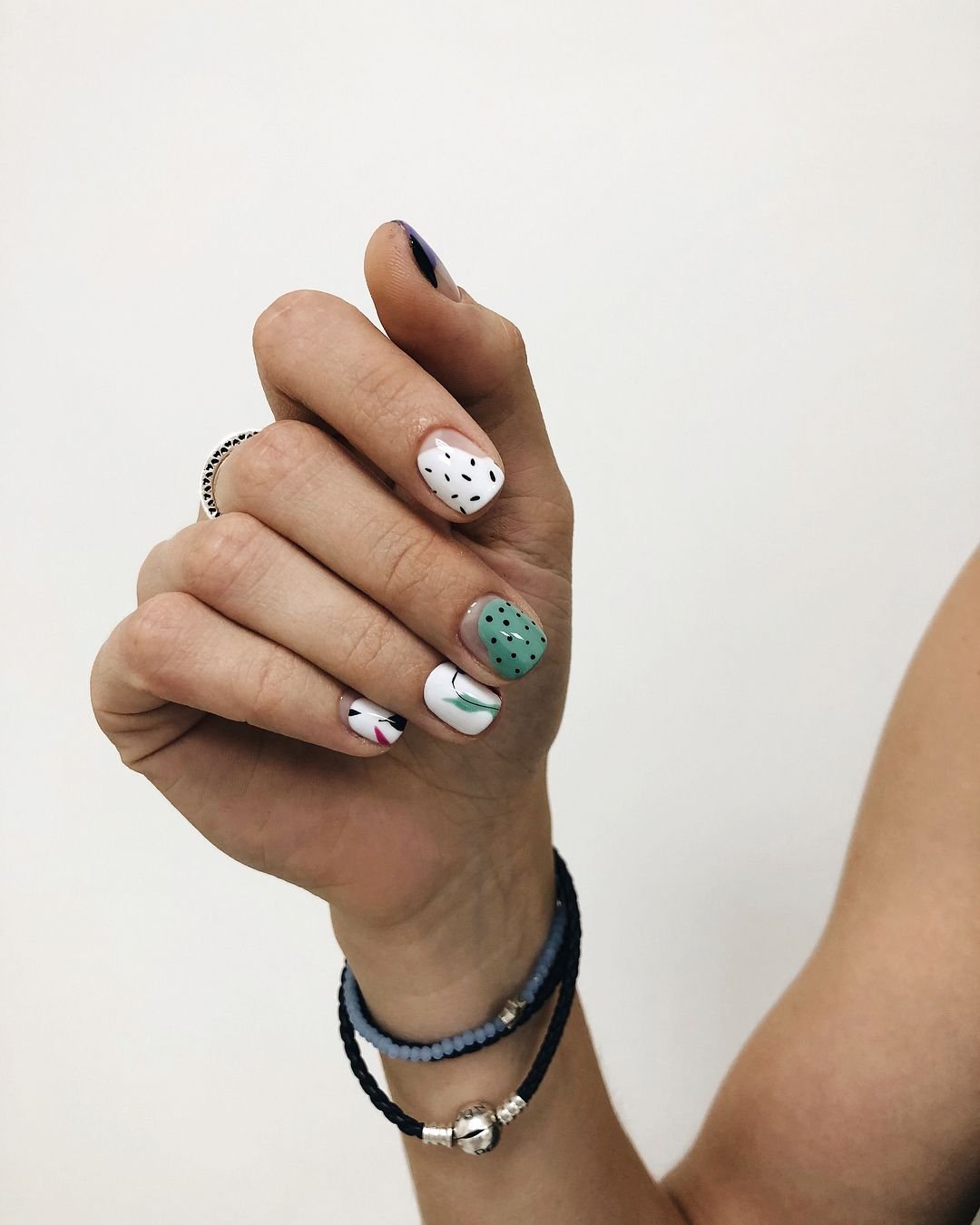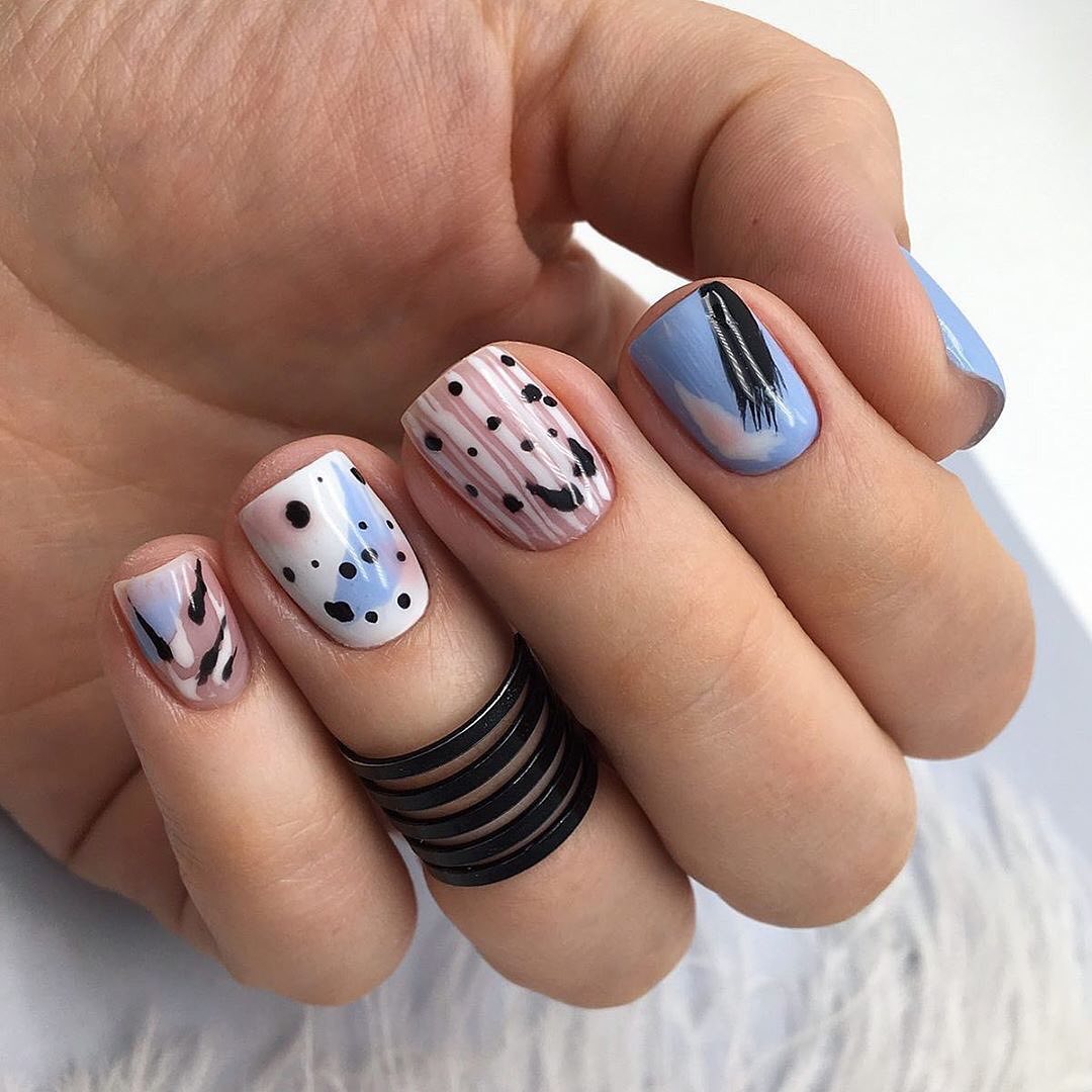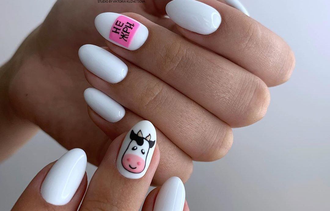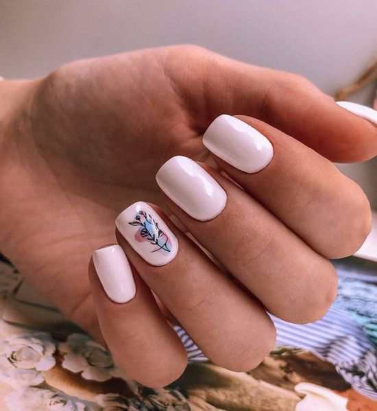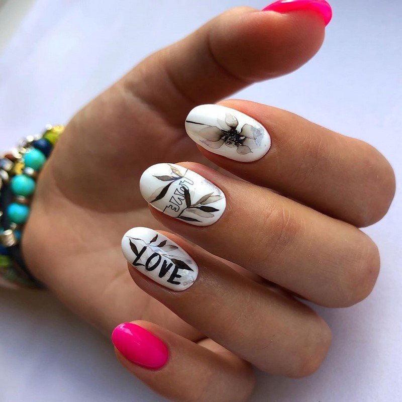 Совет: обратите внимание на вариант дизайна, когда на одной руке сделан моно дизайн. На второй руке ногти окрашены белым или нанесена молочная, нюдовая база, на которой выполнены рисунки с помощью наклеек, кисти или стемпинга.