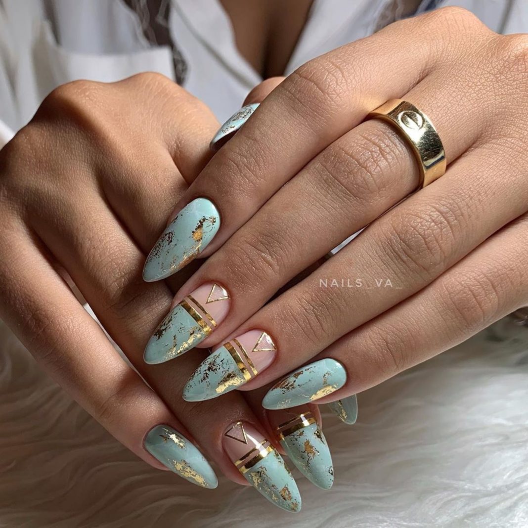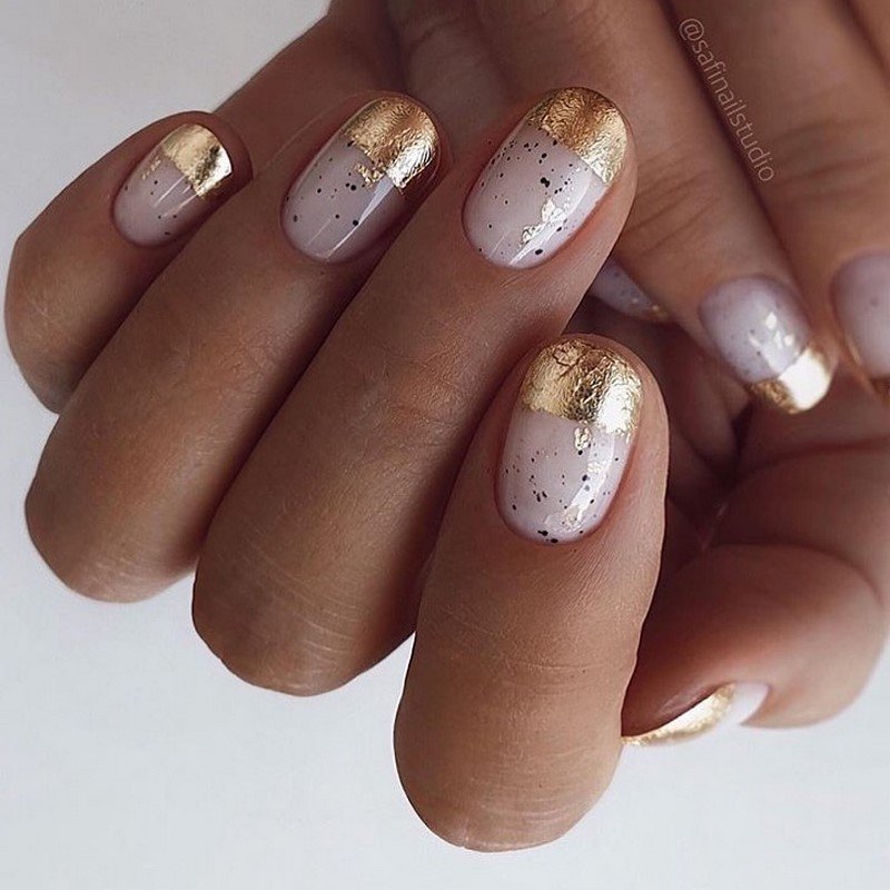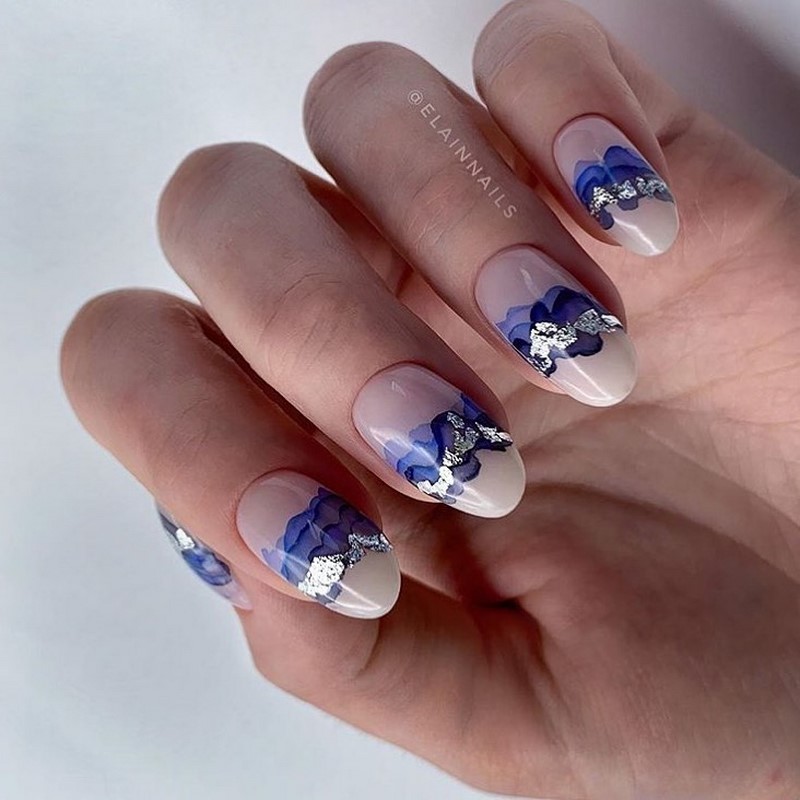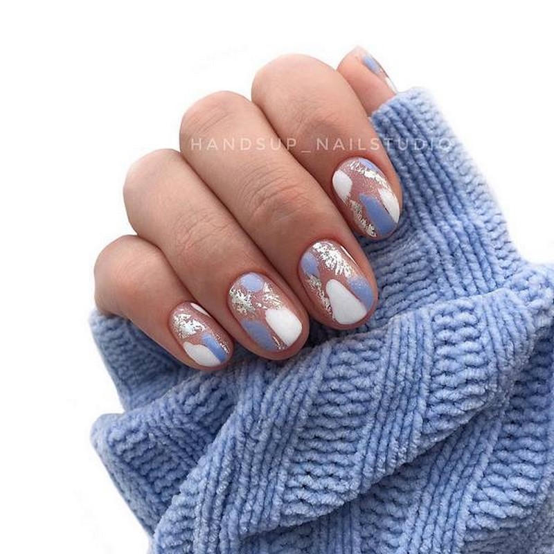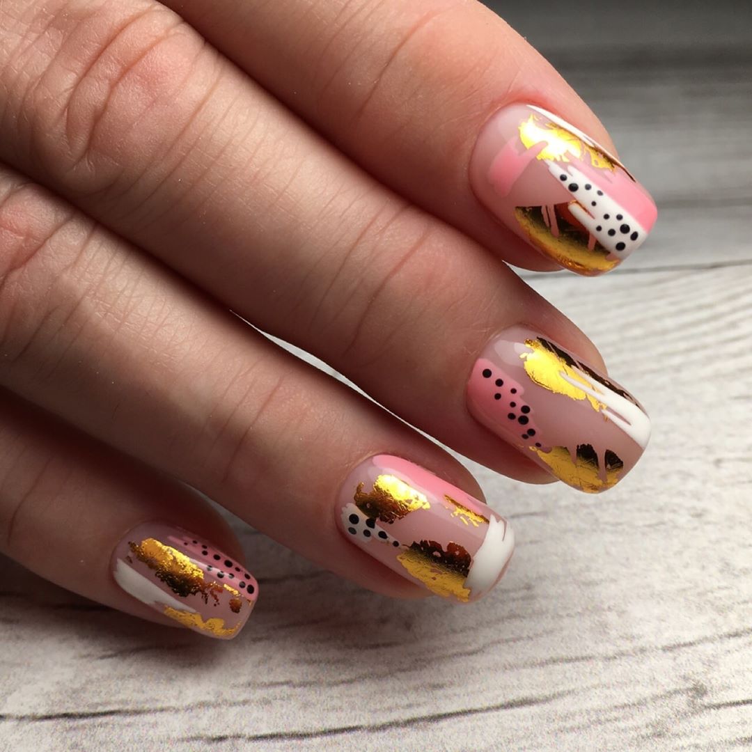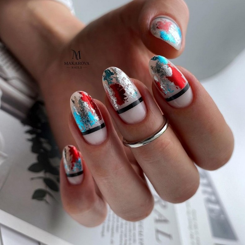 Эффектно смотрится сочетание фольги с дизайном паутинка, акварельными разводами или мазками краски. Это вариант праздничного маникюра, который можно носить и в будние дни.