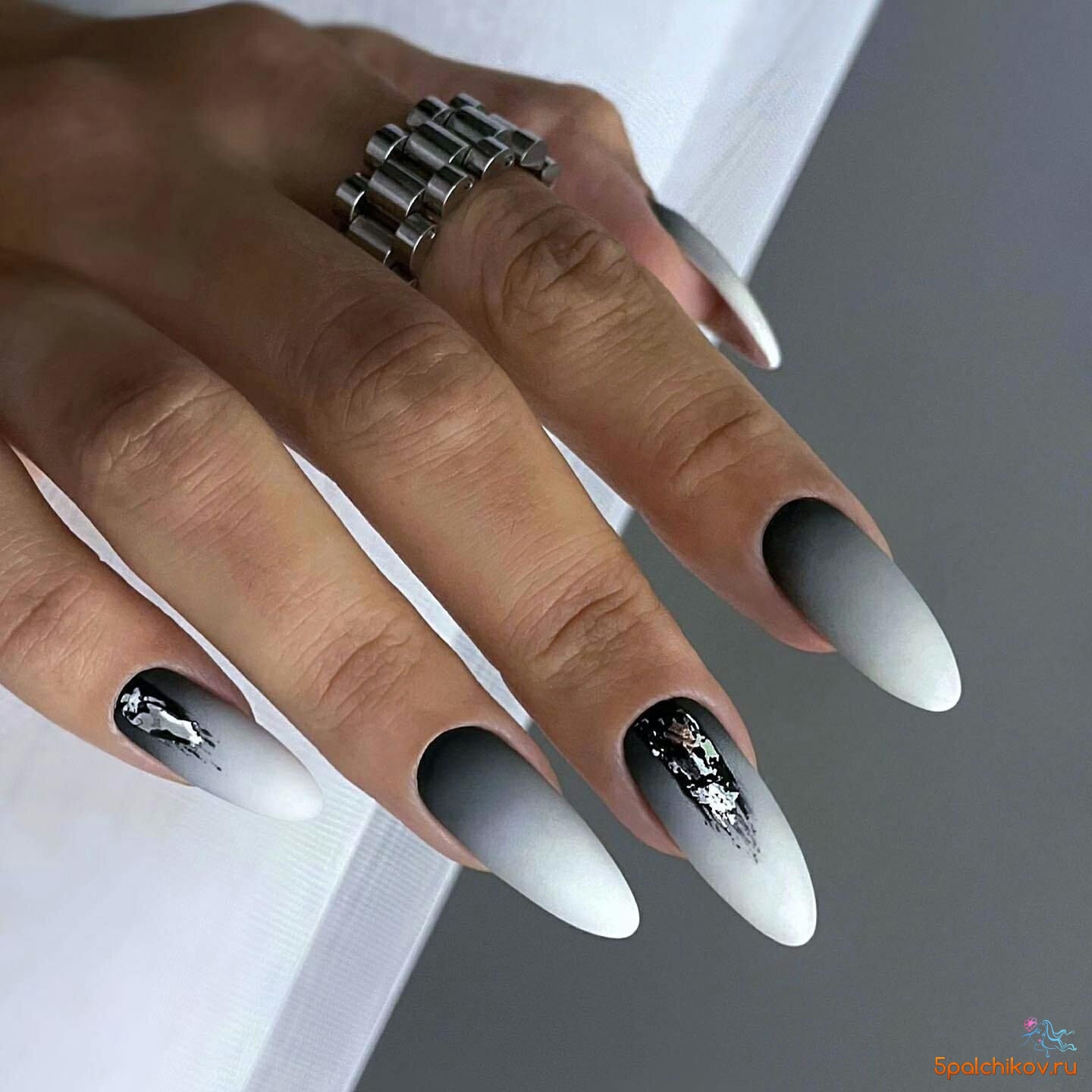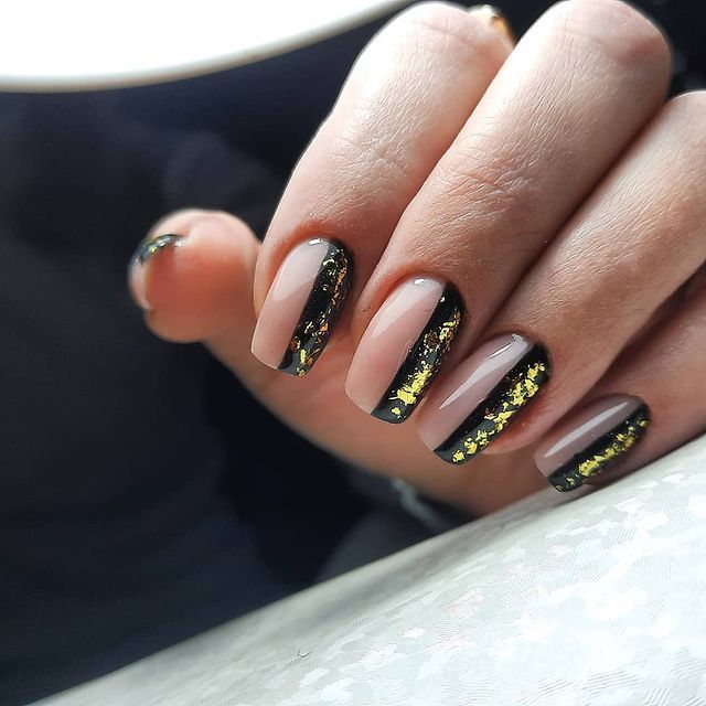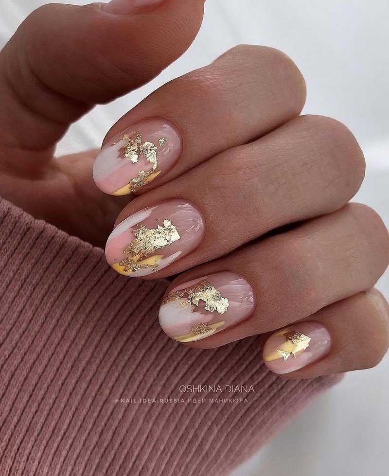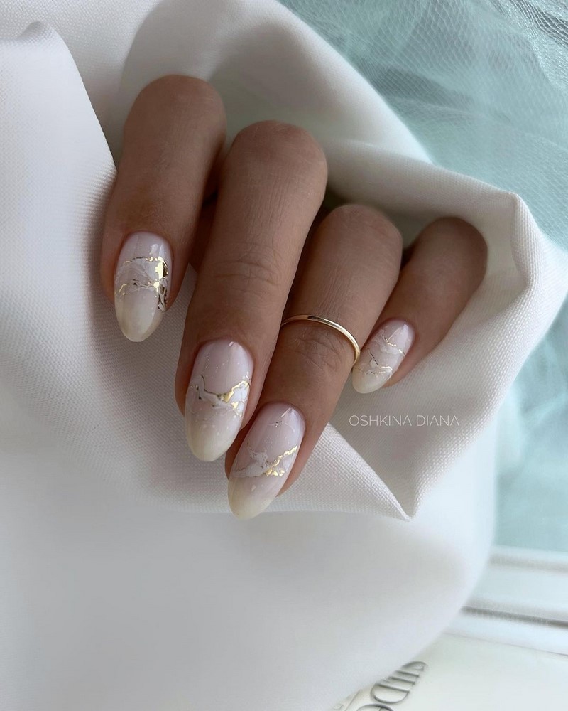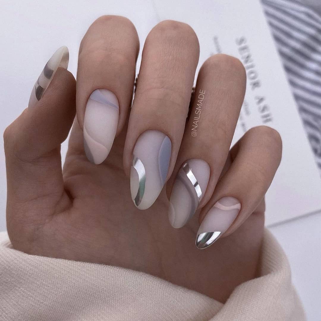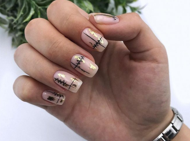 Эффектно смотрится сочетание фольги с дизайном паутинка, акварельными разводами или мазками краски. Это вариант праздничного маникюра, который можно носить и в будние дни.