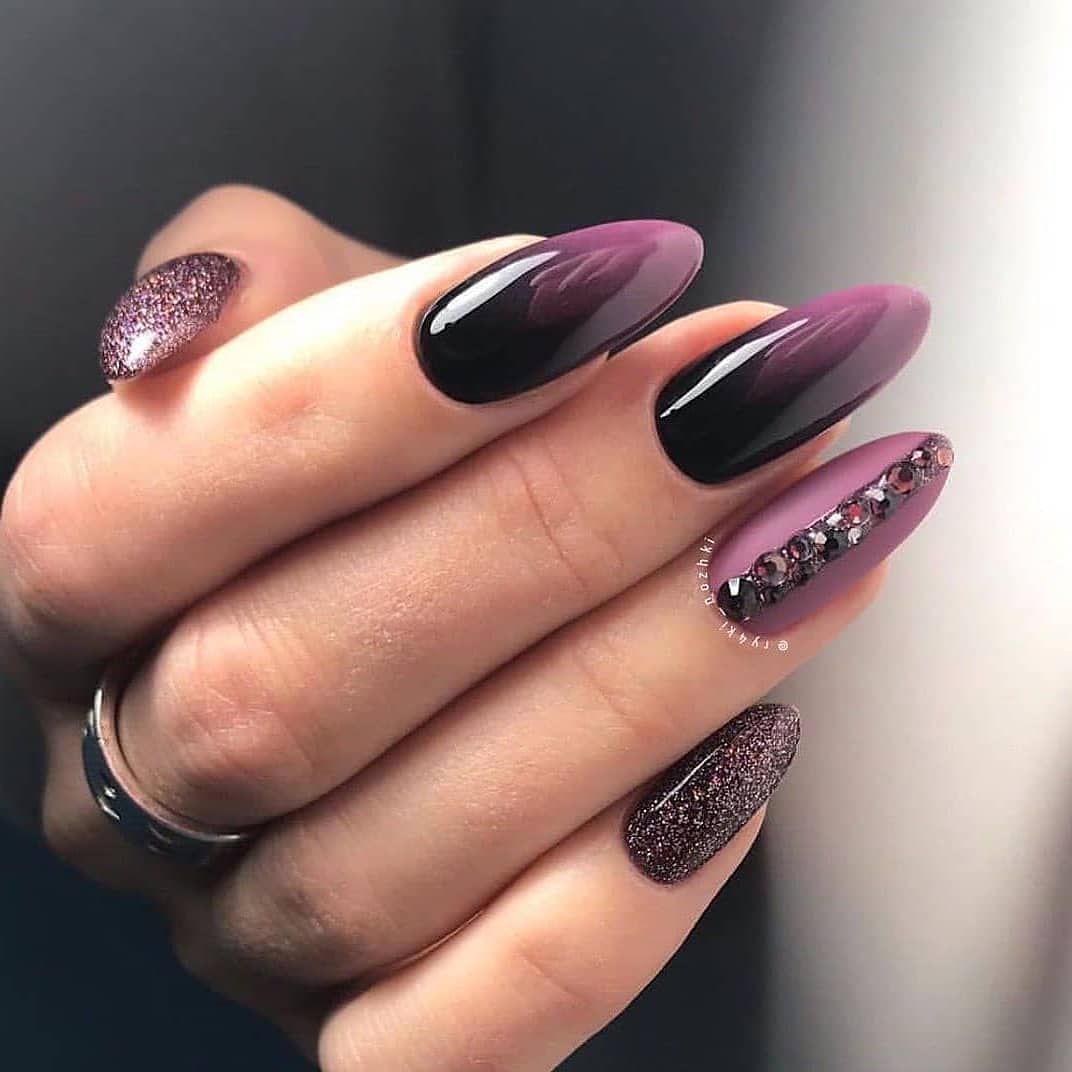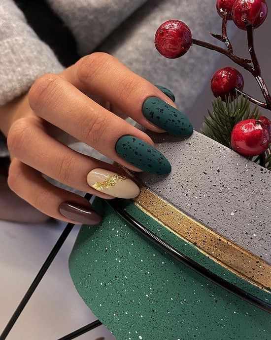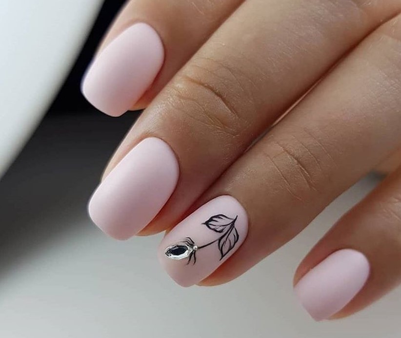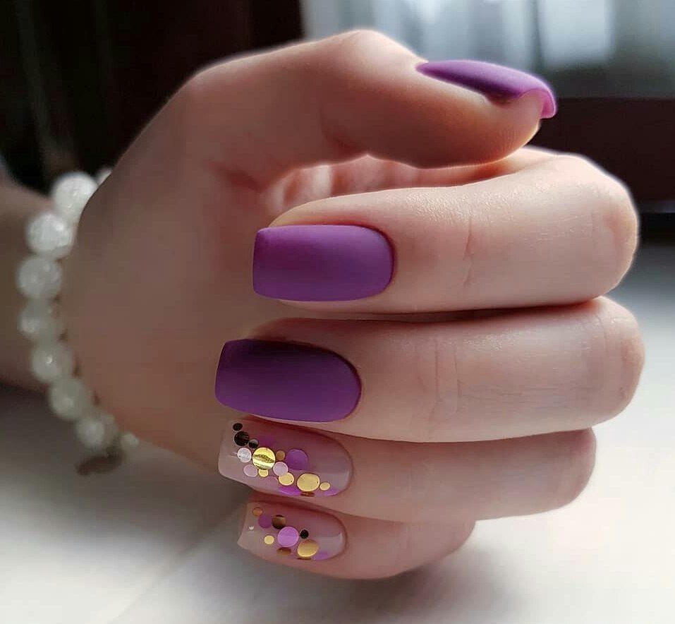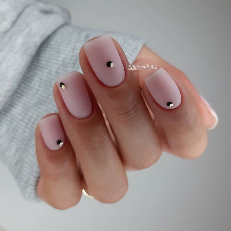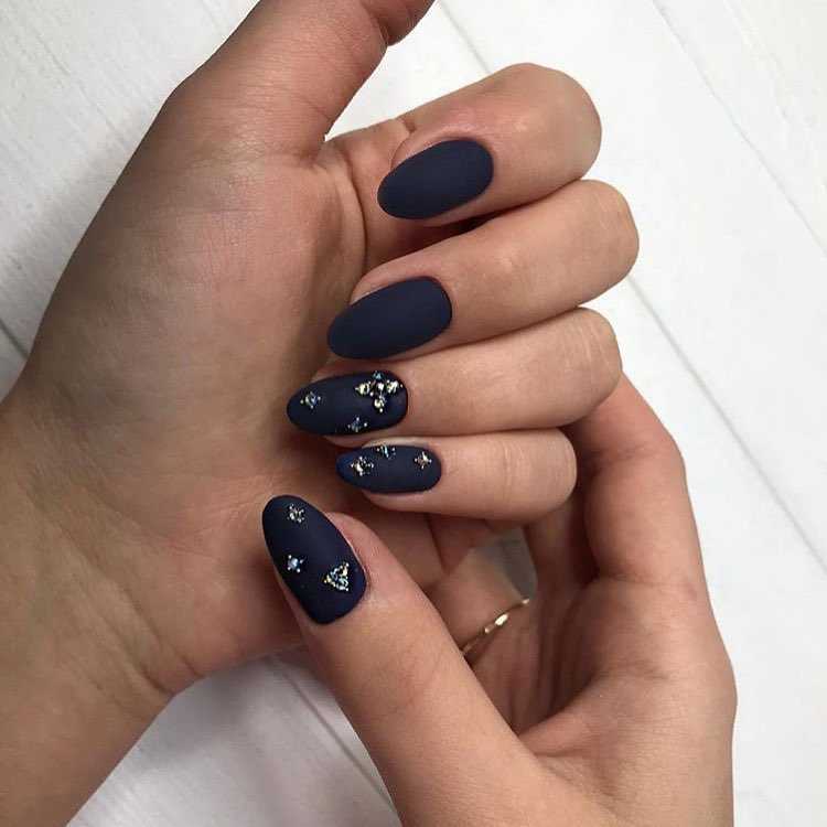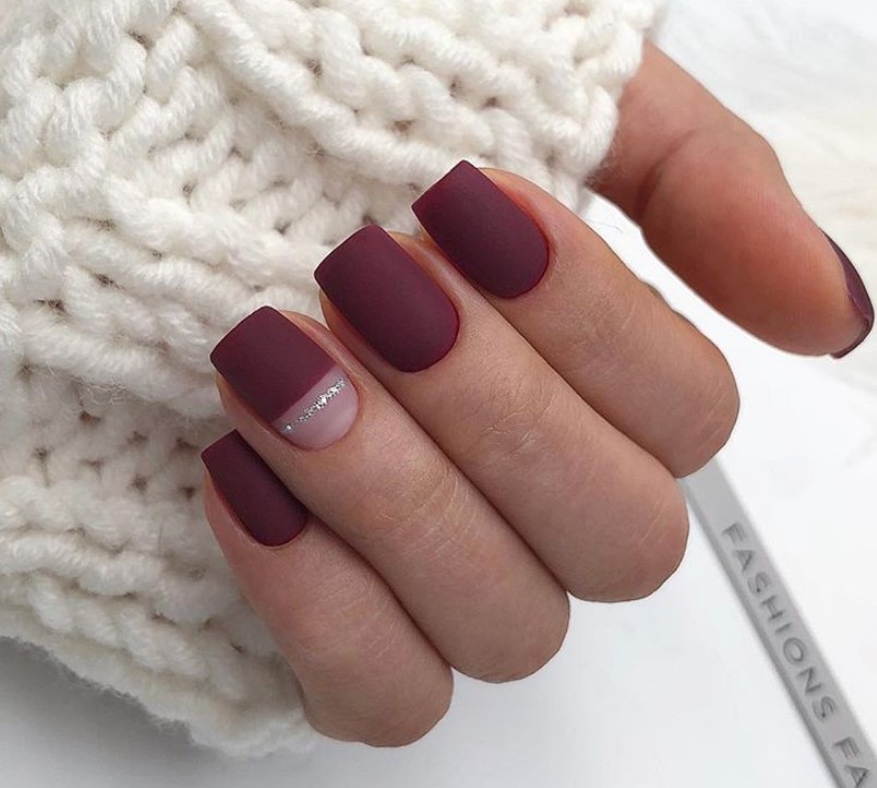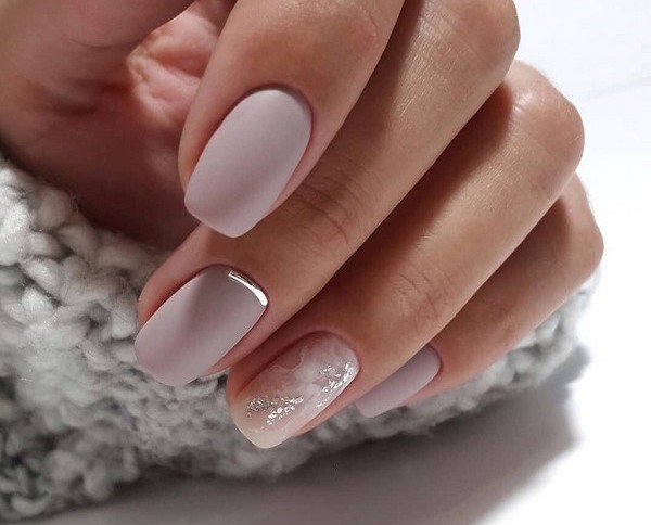 Матовый маникюр можно украсить стразами, блестками, рисунками. Эффектно смотрятся акценты, выполненные кусочками фольги.